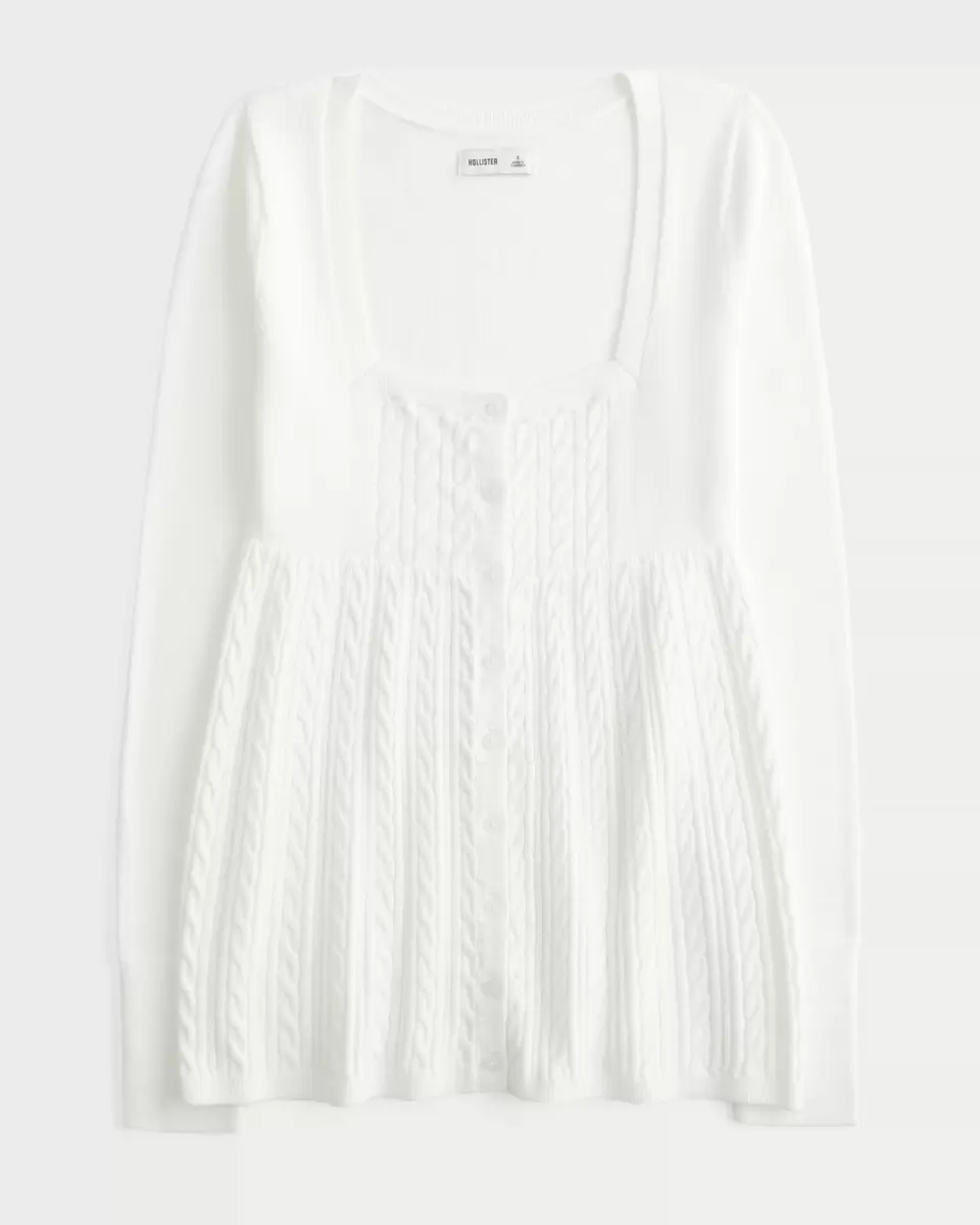 Idealny do noszenia z topem na ramiączkach lub samodzielnie, ten sweter z długim rękawem ma kwadratowy dekolt i uroczy fason babydoll inspirowany Y2K. Zapięcie na guziki z przodu, splot warkoczowy, dłuższy krój. Łatwo się układa. Importowane.