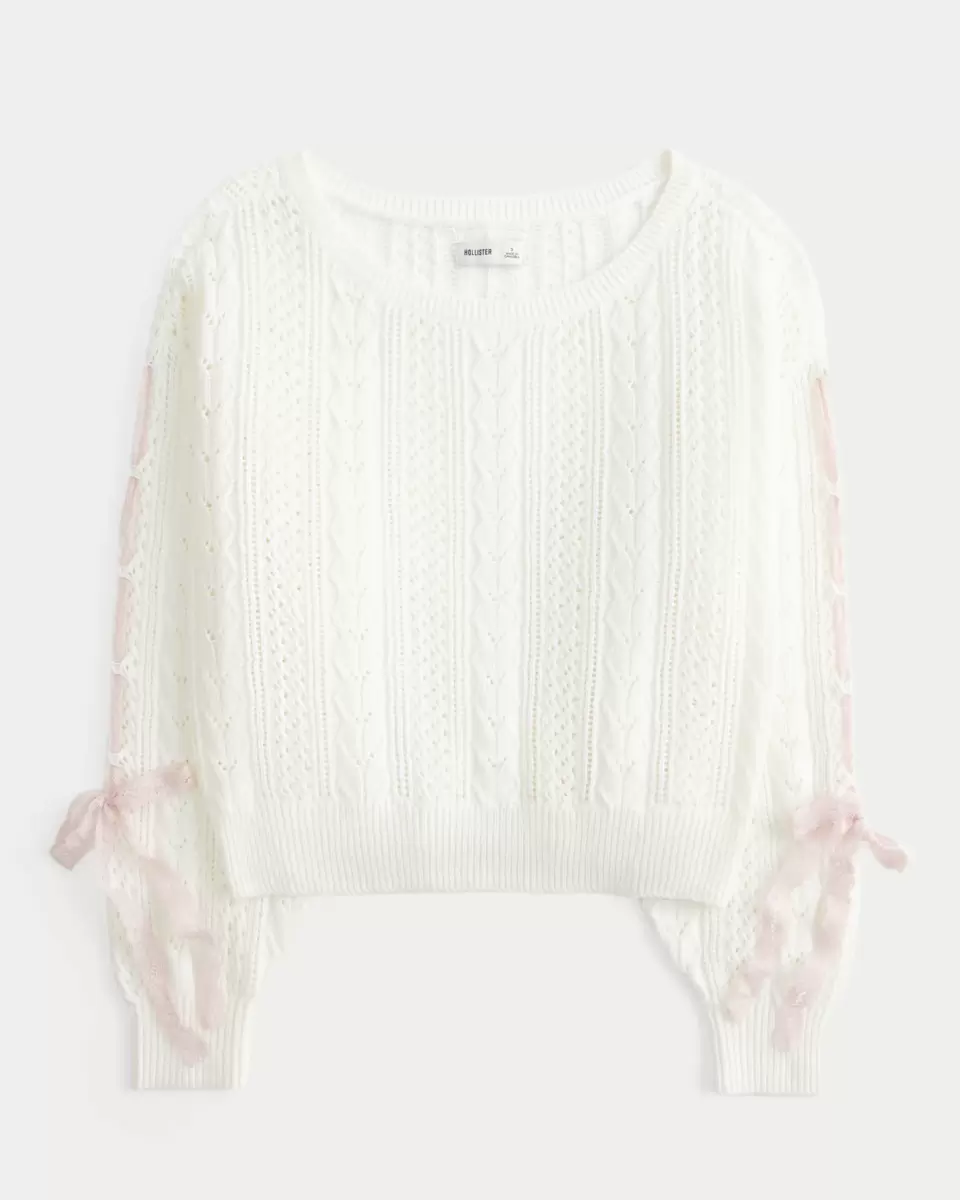 Ten supermiękki i przytulny sweterek ma ładne koronkowe wiązania w rękawach i splot warkoczowy z otwartymi ściegami. Prążkowane wykończenia, luźny dekolt, długie rękawy. Produkt importowany.