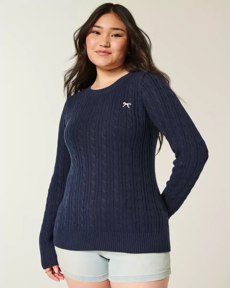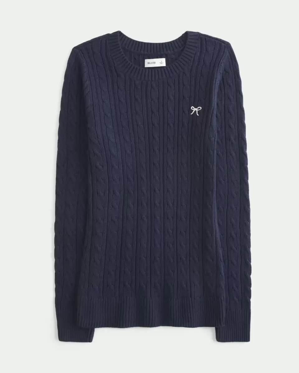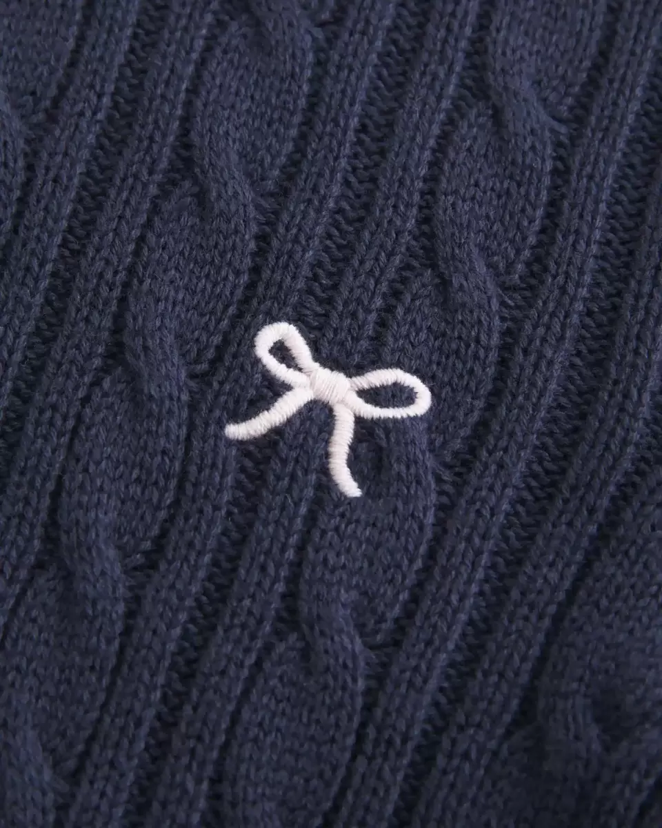 Przytulny i supermiękki sweter o splocie warkoczowym z haftowaną kokardą na lewej piersi. Okrągły dekolt, dłuższy fason, ściągacze. Dopasowany krój. Produkt importowany.