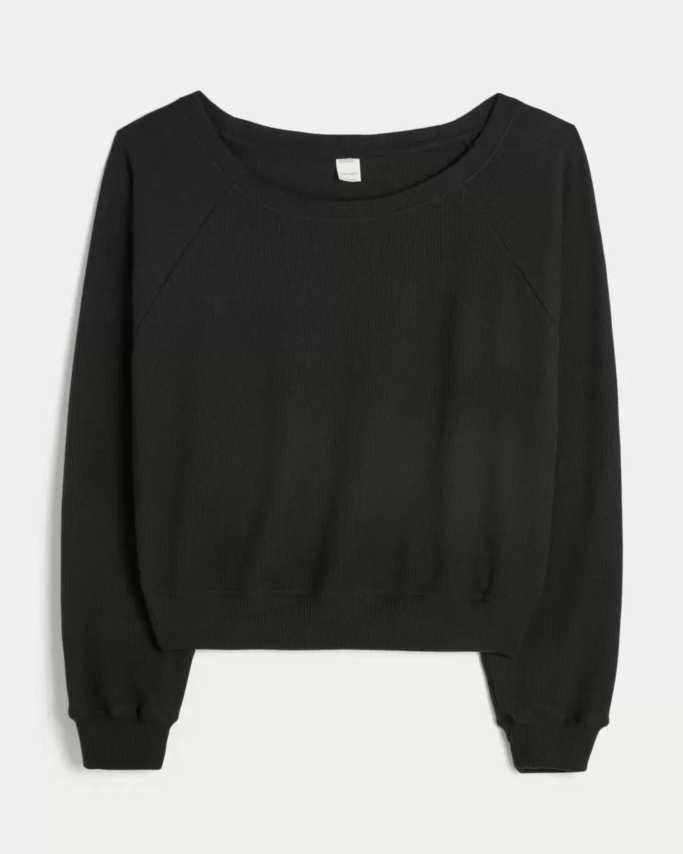 Przytulna i supermiękka bluzka z długim rękawem z tkaniny o fakturze wafla i dekoltem odsłaniającym ramiona. Produkt importowany.
