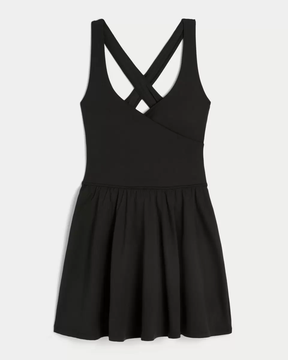Ultrawygodna sukienka sportowa wykonana z oddychającego, rozciągliwego w czterech kierunkach, odprowadzającego wilgoć materiału Recharge o supermiękkim, szczotkowanym wykończeniu. Wbudowane szorty i biustonosz sportowy, kopertowy przód i ramiączka krzyżujące się z tyłu. Importowane.