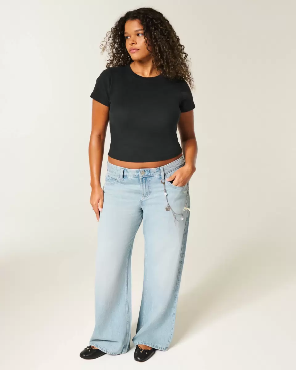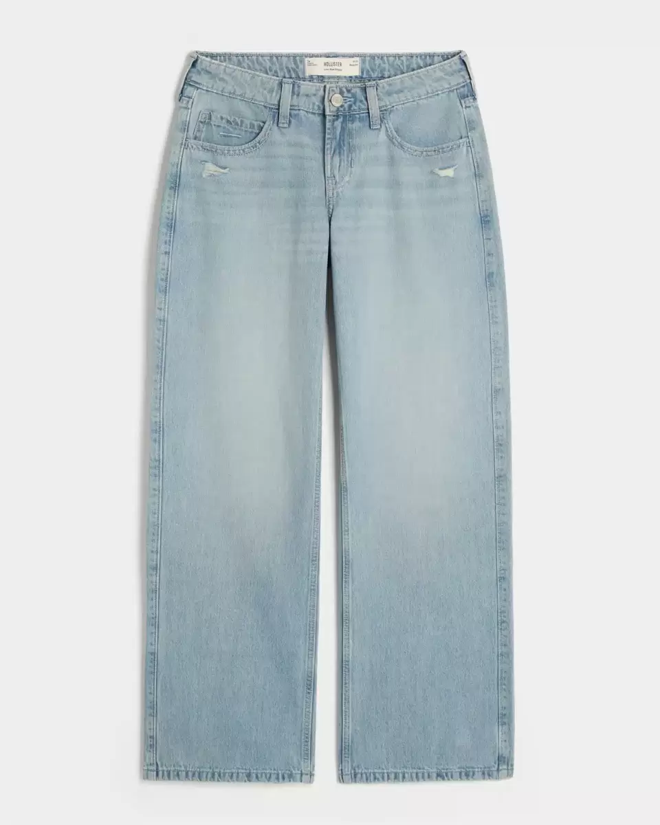 Wygodne jeansy z niskim stanem i luźnymi nogawkami. Wyblaknięcia, przetarcia i przetarcia.