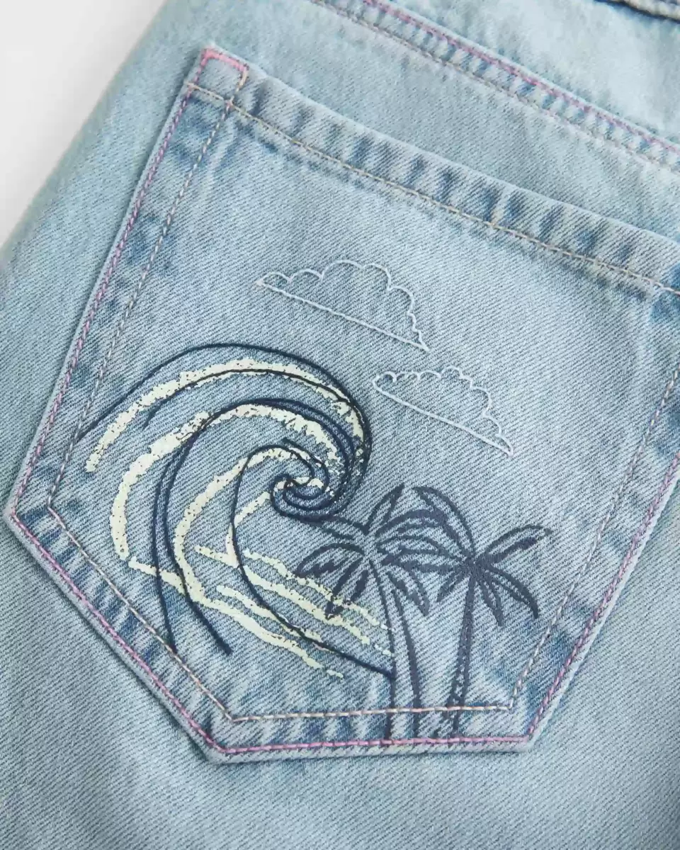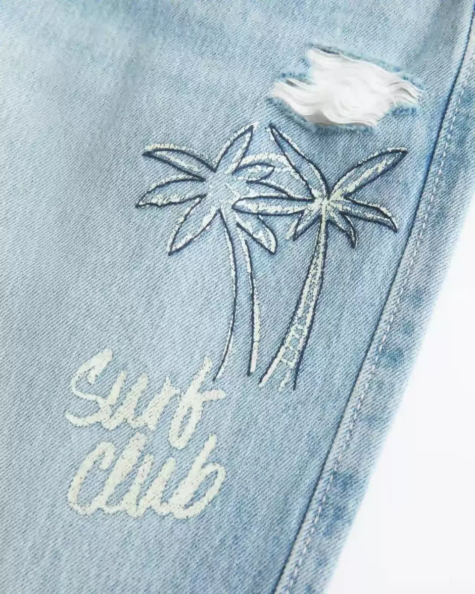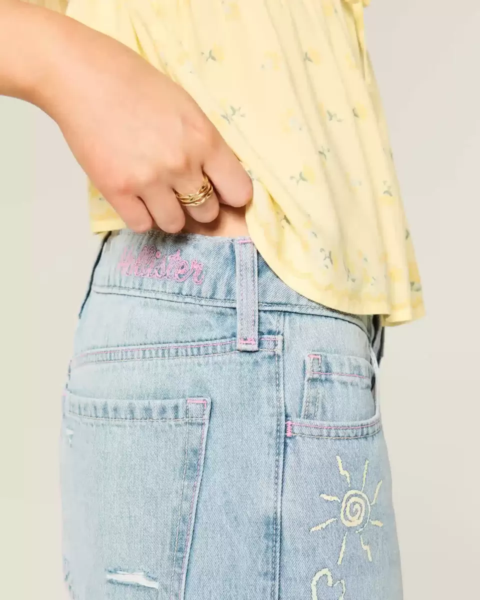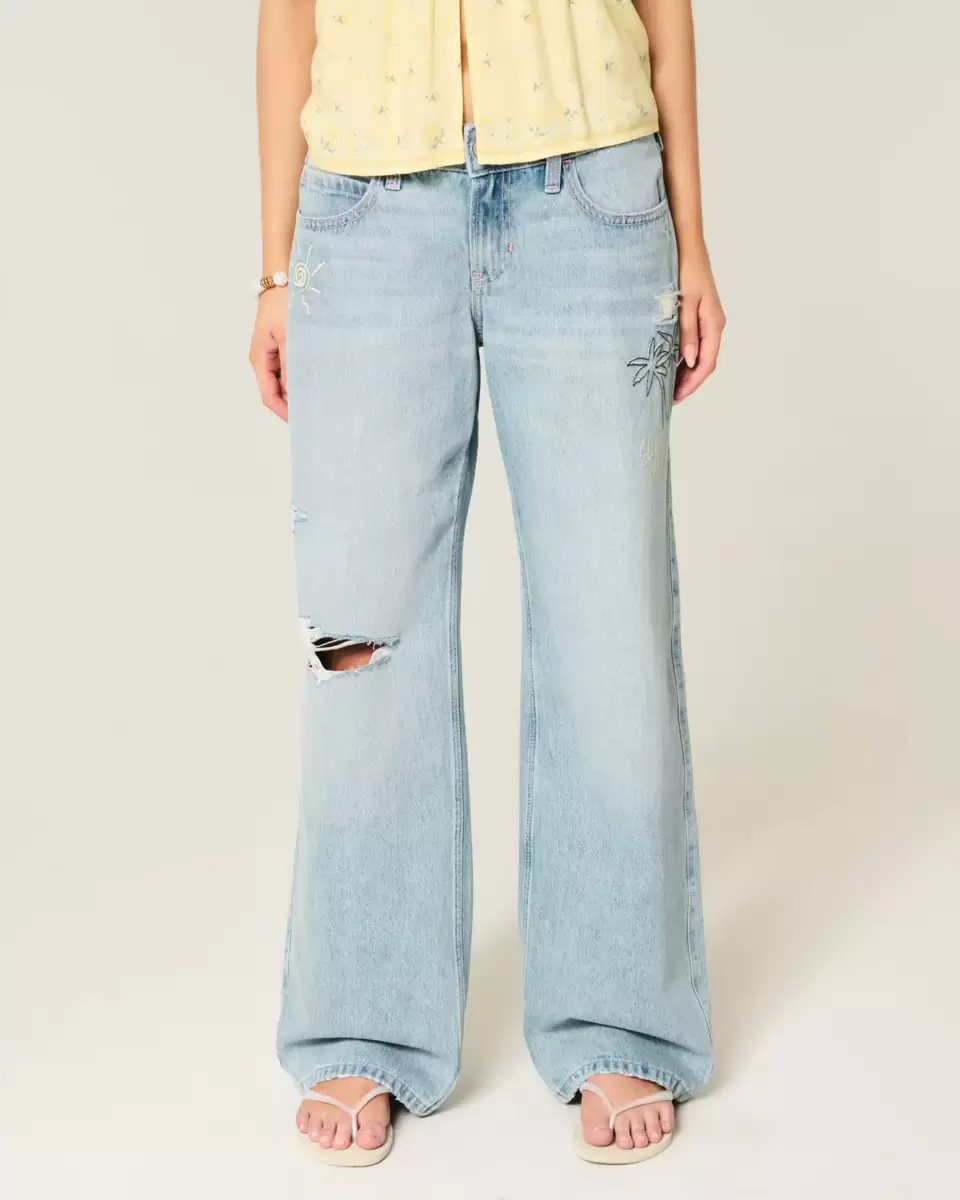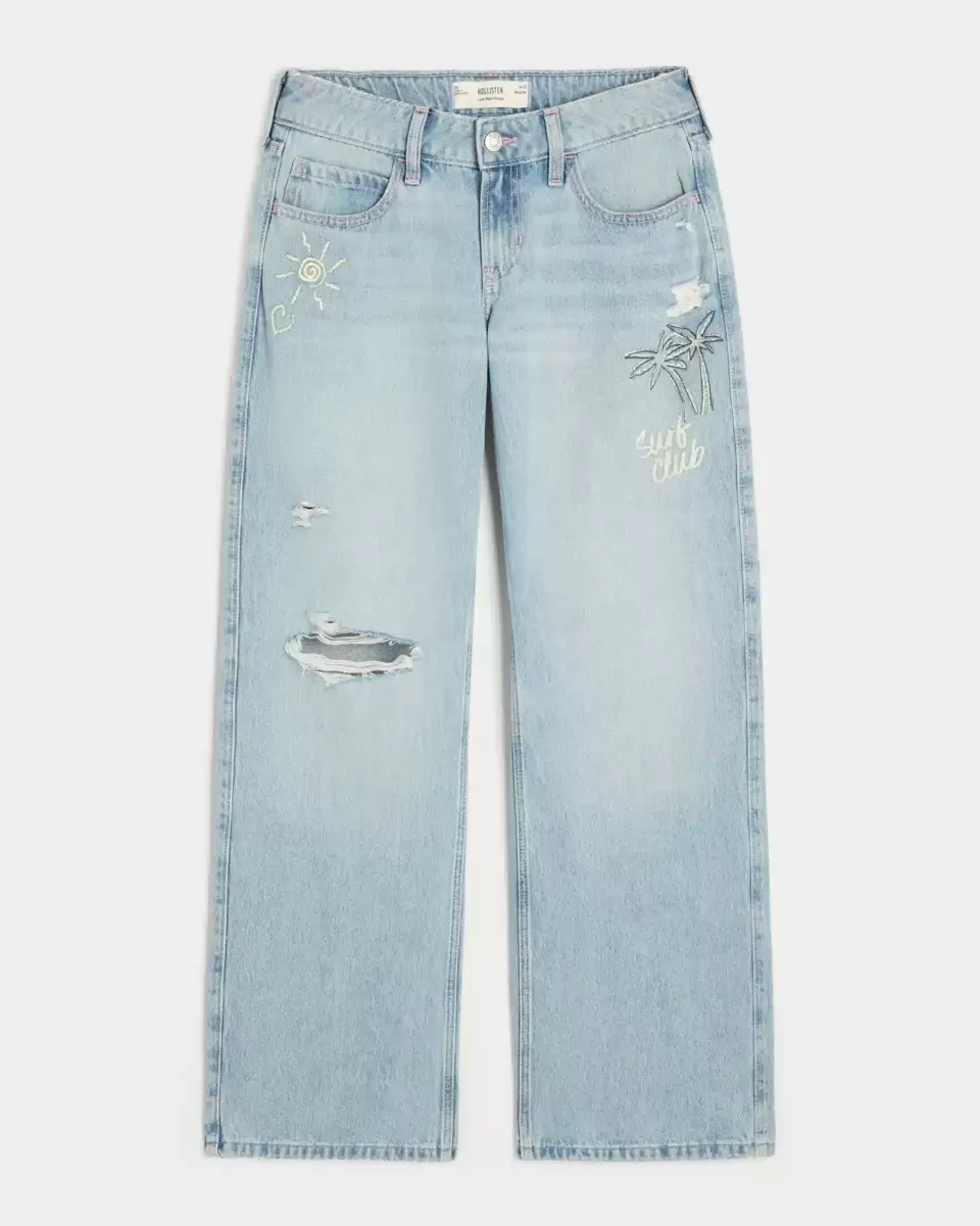 Wygodne jeansy z niskim stanem i luźnymi nogawkami. Lekkie spranie z przetarciami, przetarciami i przetarciami. Haftowana grafika. Importowane.