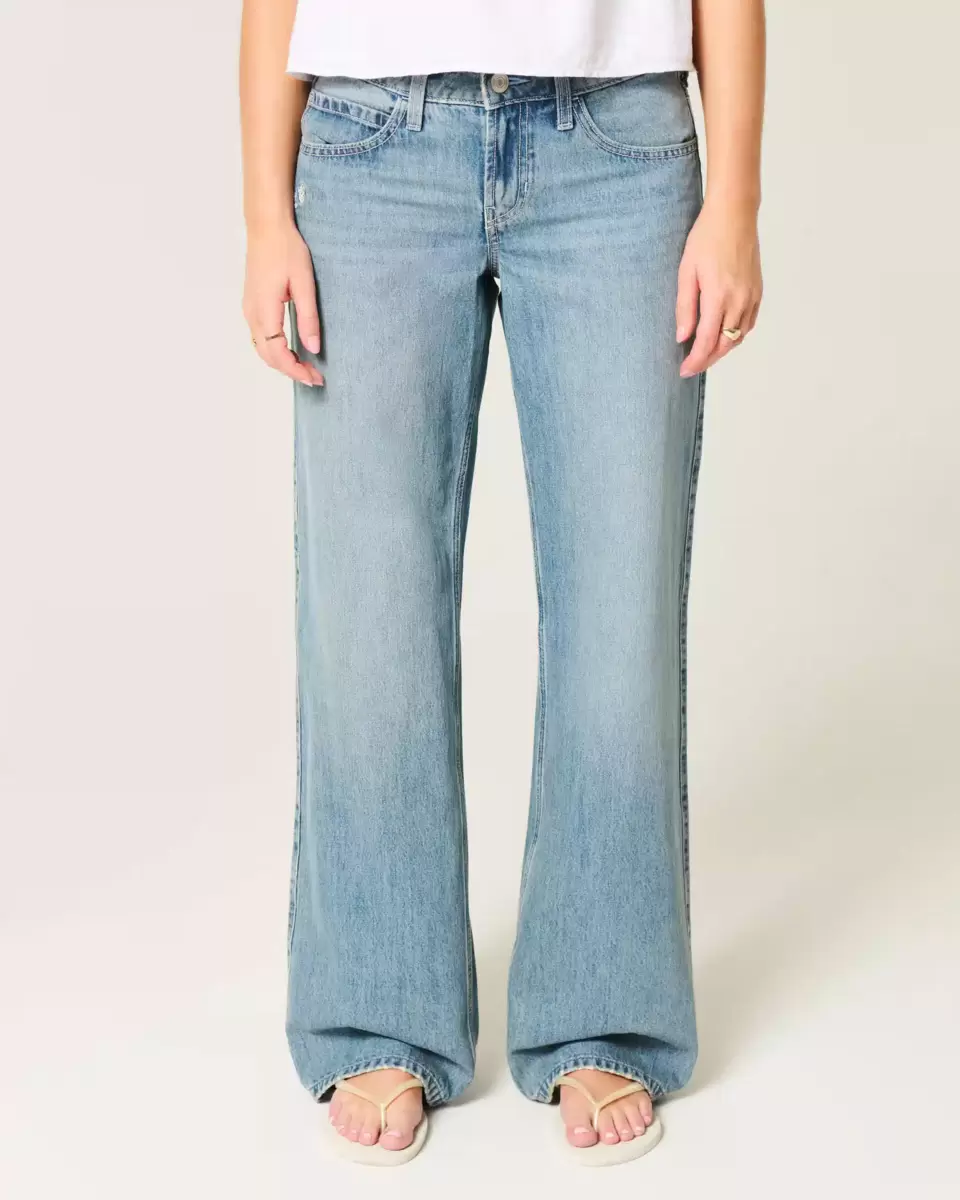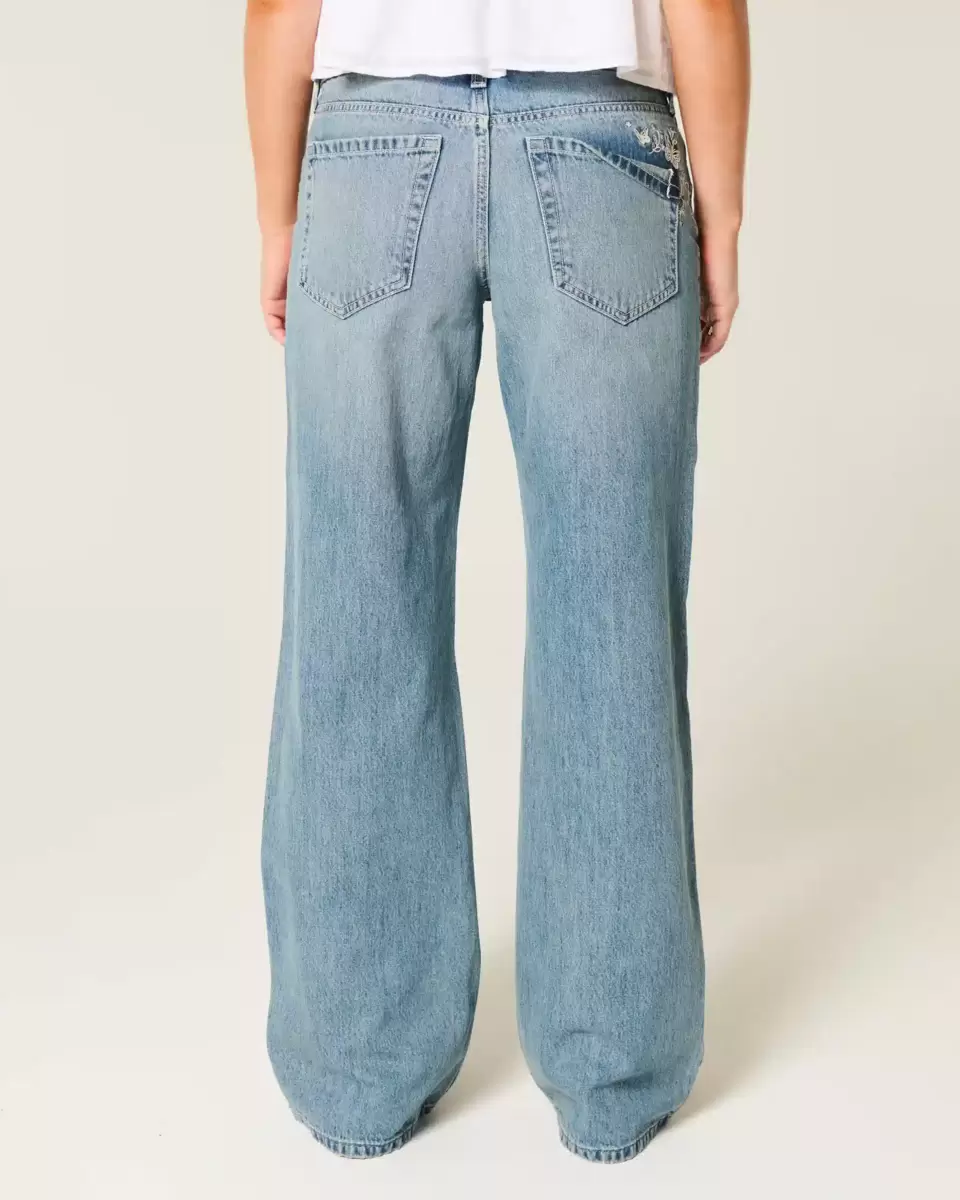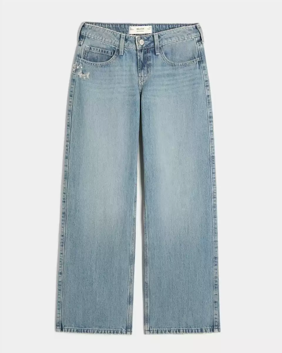 Wygodne jeansy w średnim odcieniu, z luźną nogawką i atrakcyjnym, niskim stanem. Haftowane motyle po prawej stronie i na tylnej kieszeni. Detale na tylnej kieszeni, wyblakłe, z wąsami. Importowane.