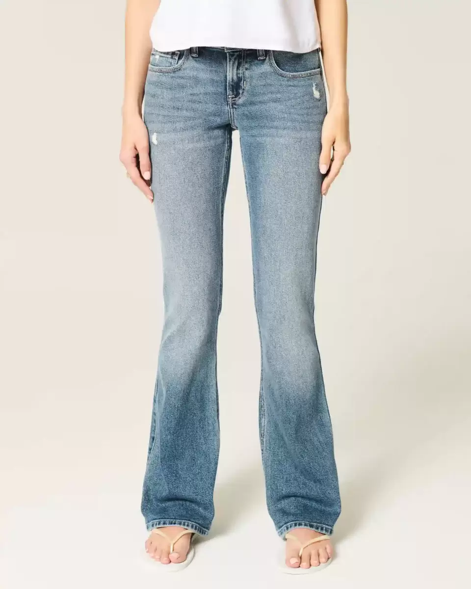 Wygodne jeansy jeansowe w średnim odcieniu, zaprojektowane z atrakcyjnym niskim stanem, wąską nogawką i rozszerzanymi nogawkami. Jeans vintage z elastycznym denimem z przetarciami, przetarciami i przetarciami. Importowane.