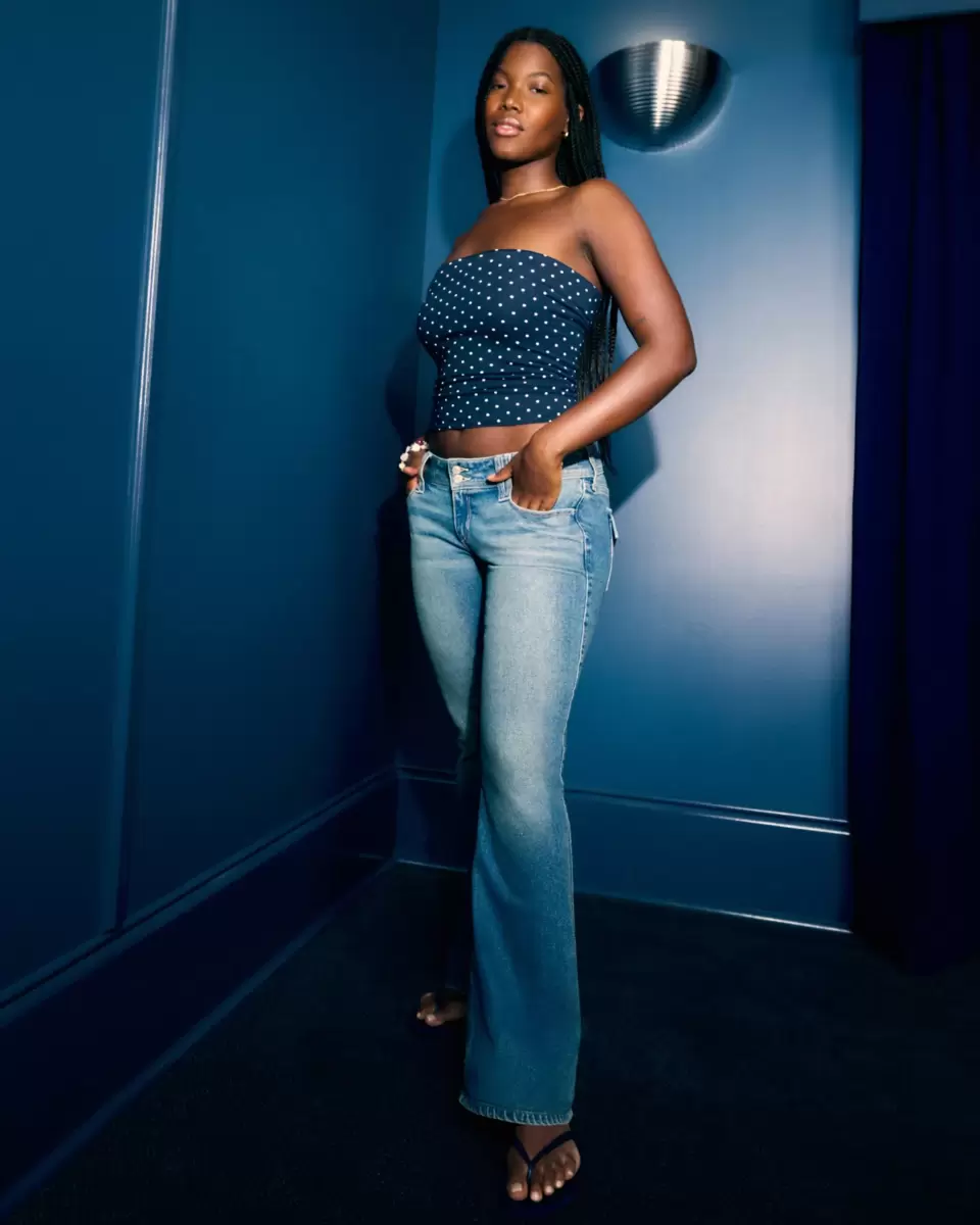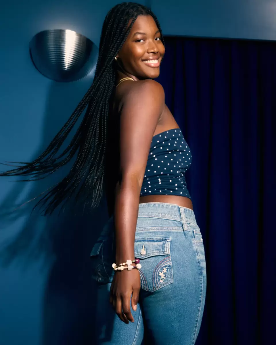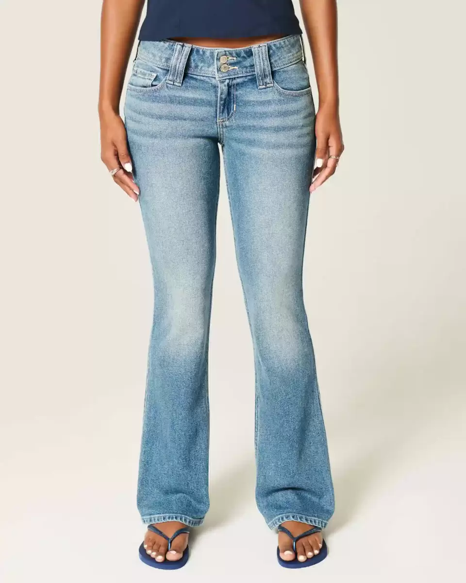 Wygodne jeansy jeansowe w średnim odcieniu, z atrakcyjnym niskim stanem, wąską nogawką i rozszerzanymi nogawkami. Jeansy vintage z elastycznym denimem z przetarciami i przetarciami. Urocze, haftowane kwiatowe detale na tylnych kieszeniach. Importowane.