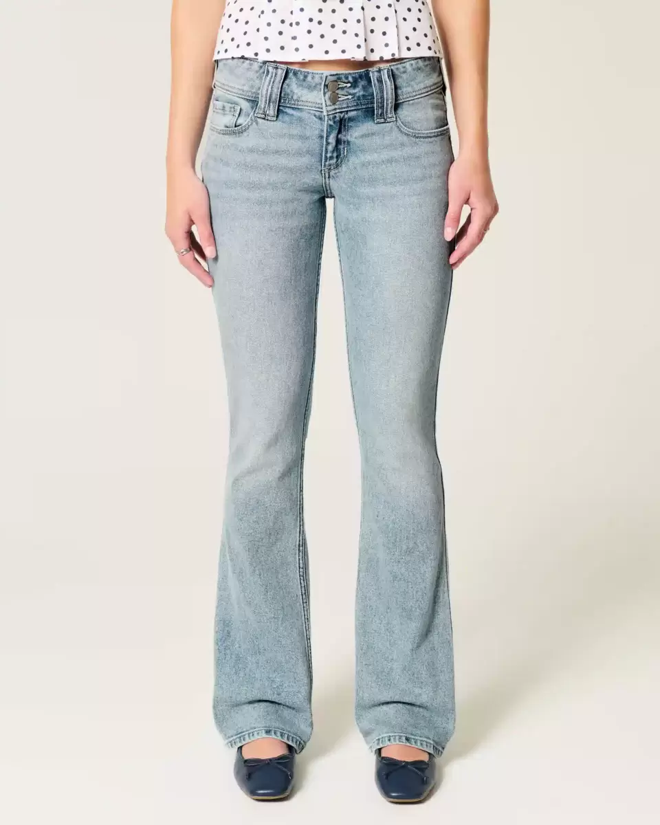 Wygodne, inspirowane Y2K jeansy z niskim stanem, wąską nogawką i rozcięciem typu bootcut. Wyblaknięcia i przetarcia. Importowane.