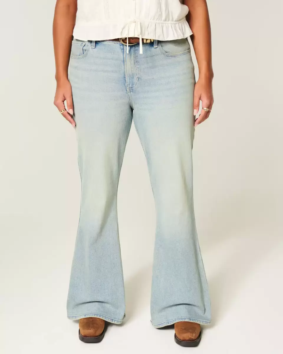 Wygodne jeansy z denimu Vintage Stretch, z atrakcyjnym wysokim stanem i rozszerzonymi nogawkami. Ozdobne przeszycia w kształcie gwiazdek na tylnych kieszeniach, lekko sprane, z przetarciami i przetarciami. Importowane.