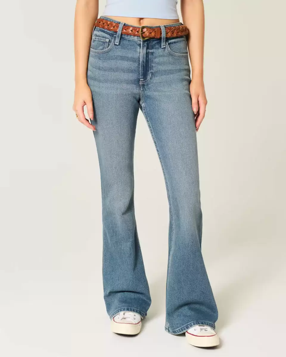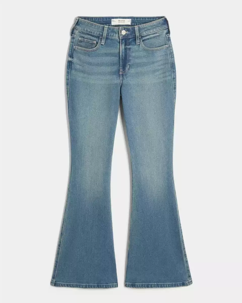 Wygodne jeansy jeansowe w średnim odcieniu, z atrakcyjnym wysokim stanem, wąską nogawką i rozkloszowanym dołem. Jeansy vintage ze stretchem i przetarciami. Importowane.