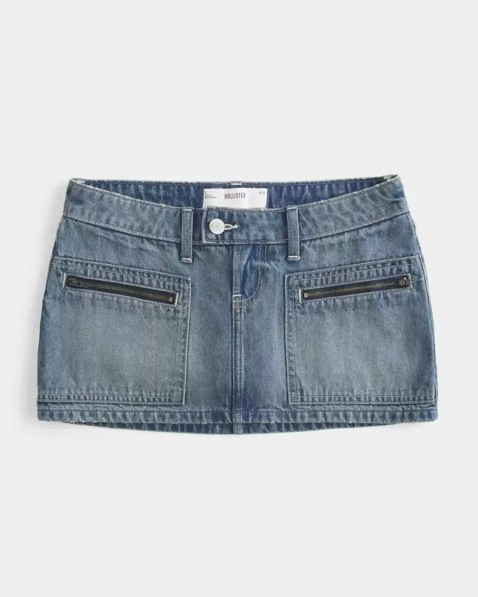 Urocza, dżinsowa mini spódniczka z bardzo niskim stanem i ukrytymi dzianinowymi szortami. Średnio sprany kolor z przetarciami i wąsami. Importowane.