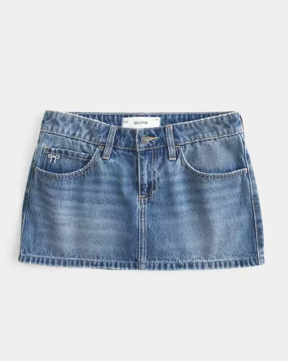 Urocza mini spódniczka z jeansu z niskim stanem i ukrytymi dzianinowymi szortami. Wyblakłe, postrzępione, różowe kokardki i haftowane serduszka wzdłuż tylnych kieszeni, haftowana kokardka przy prawej kieszonce na monety. Średnio sprany. Importowane.