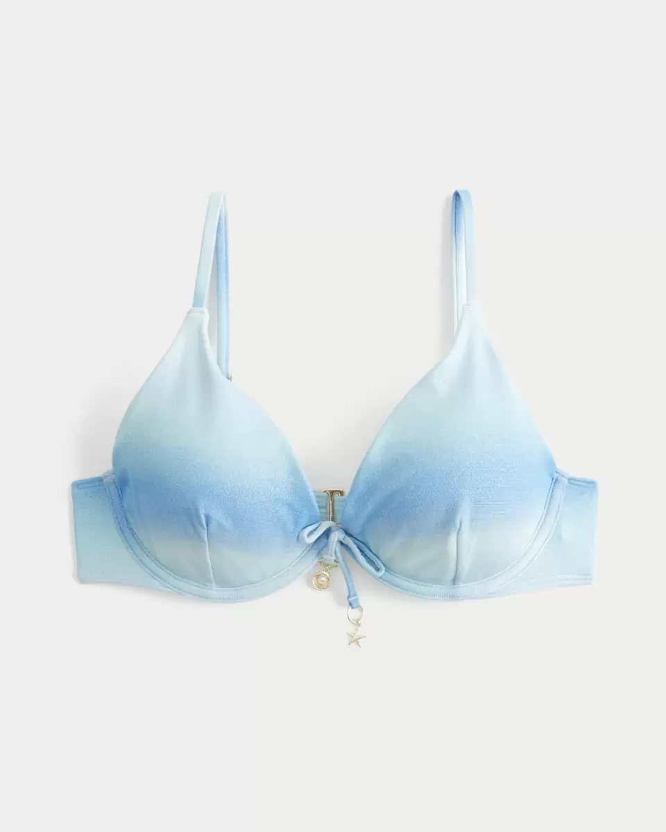 Ten uroczy stanik bikini wykonany jest z miękkiego materiału kąpielowego z połyskiem i ozdobiony metalowymi zawieszkami. Regulowane ramiączka, wiązanie z przodu, zapięcie na haftki w kształcie łabędzia, fiszbiny. Importowane.