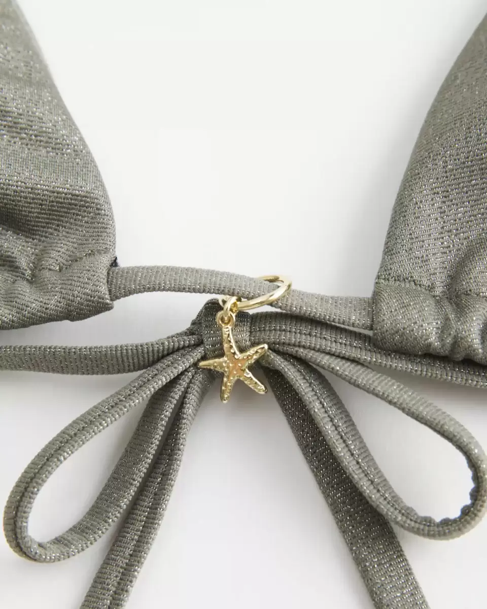 Wykonany z miękkiego materiału do pływania z połyskiem, ten top od bikini można nosić jako halter lub odwrócony do góry nogami, aby uzyskać efekt bandeau/trójkąta. Uroczy, metalowy element z zawieszką. Importowane.