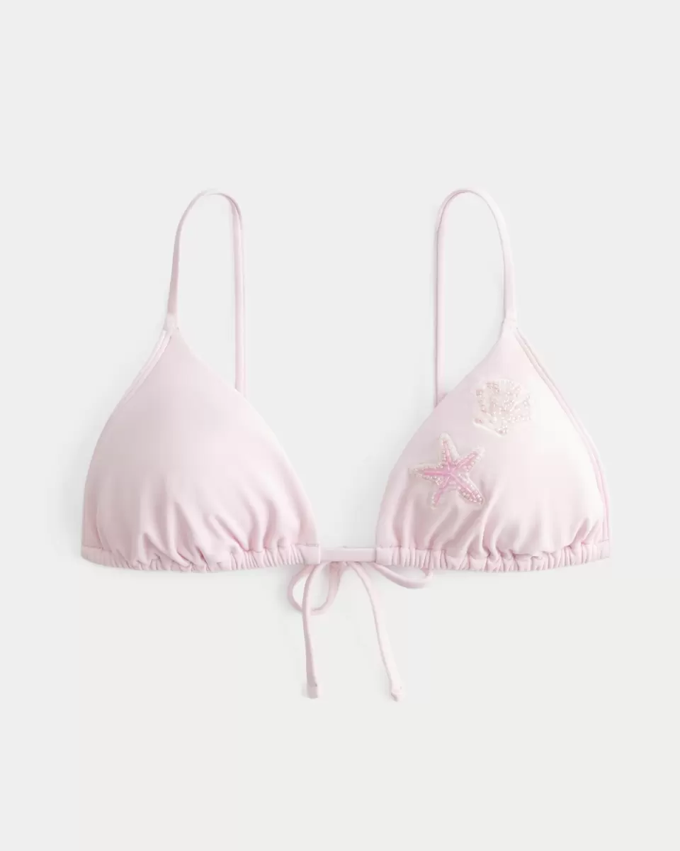 Uroczy top bikini o trójkątnym kroju, z regulowanymi ramiączkami na ramionach i haftowanymi naszywkami z koralikami. Wiązany na szyi, wyjmowane wkładki.