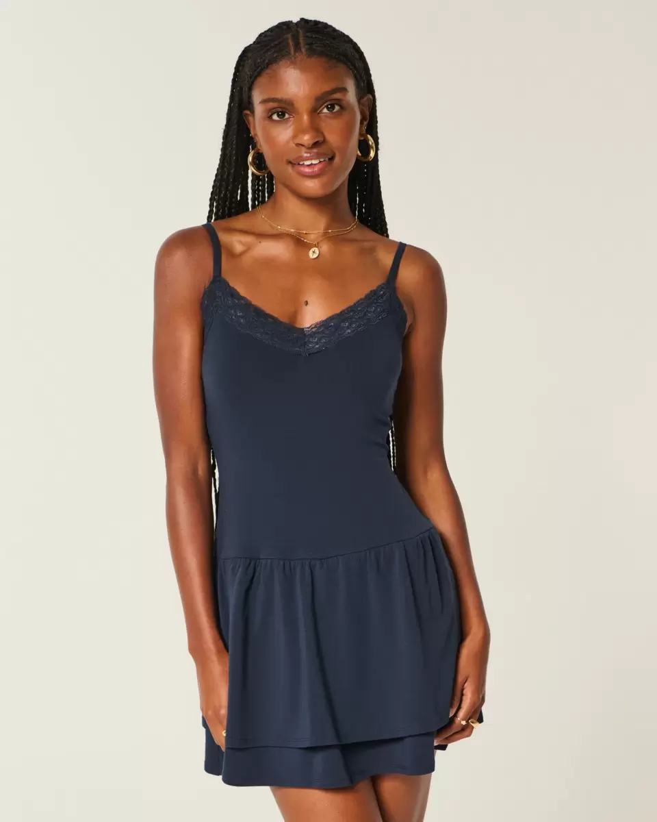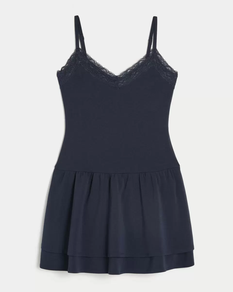 Ta śliczna, krótka sukienka w stylu koszuli jest wykonana z miękkiej dzianiny, ma warstwowy dół i koronkowe wykończenie wzdłuż dekoltu.
