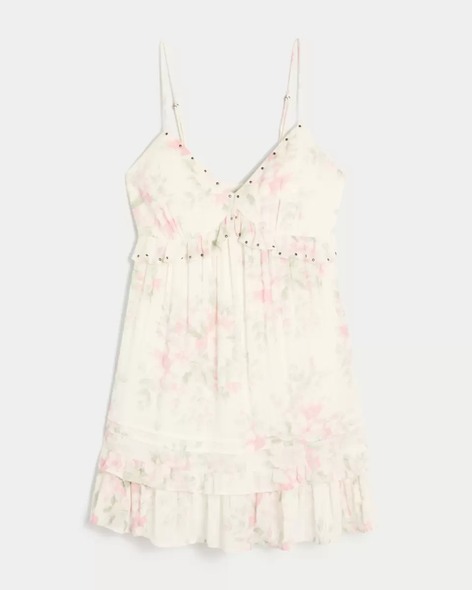 Ta luźna i supermiękka mini sukienka ma falbaniasty dół i ćwieki wzdłuż dekoltu i pod biustem. Regulowane ramiączka. Importowane.