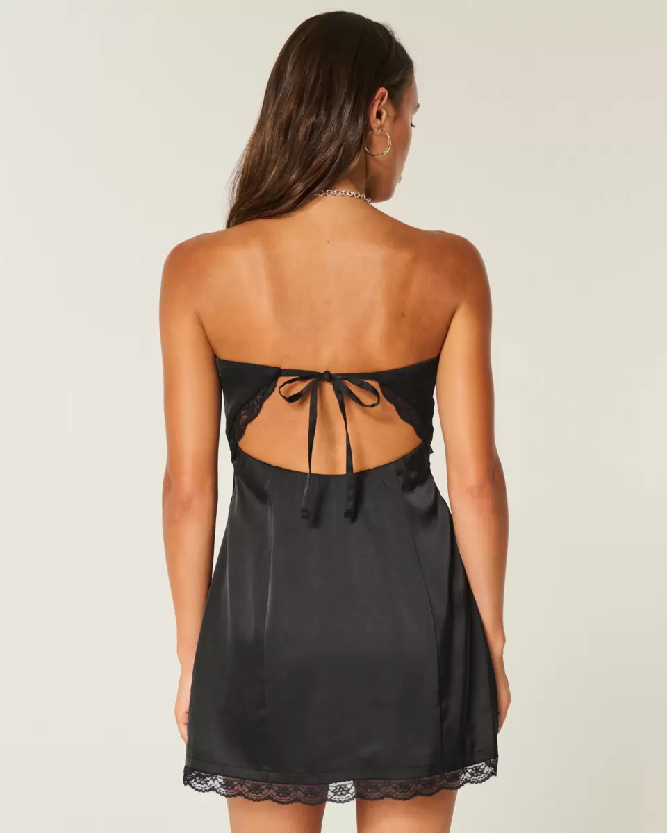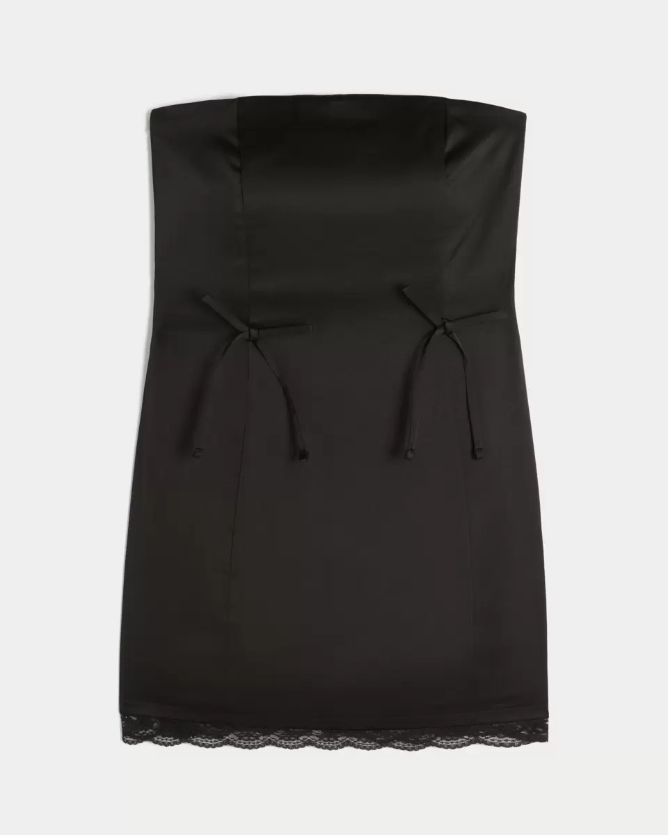 Ta superśliczna sukienka jest wykonana z miękkiej satyny i ozdobiona kokardkami. Bez ramiączek, z ładną koronkową lamówką u dołu, dopasowana do sylwetki. Importowane.