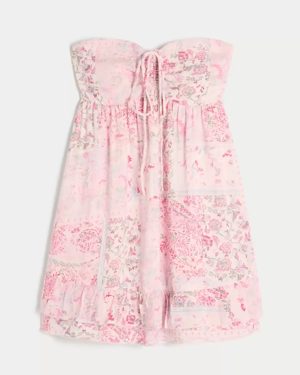 Zwiewna i supermiękka mini sukienka z falbaniastym, warstwowym dołem. Bez ramiączek, ściągana wiązaniem na środku biustu. Importowane.
