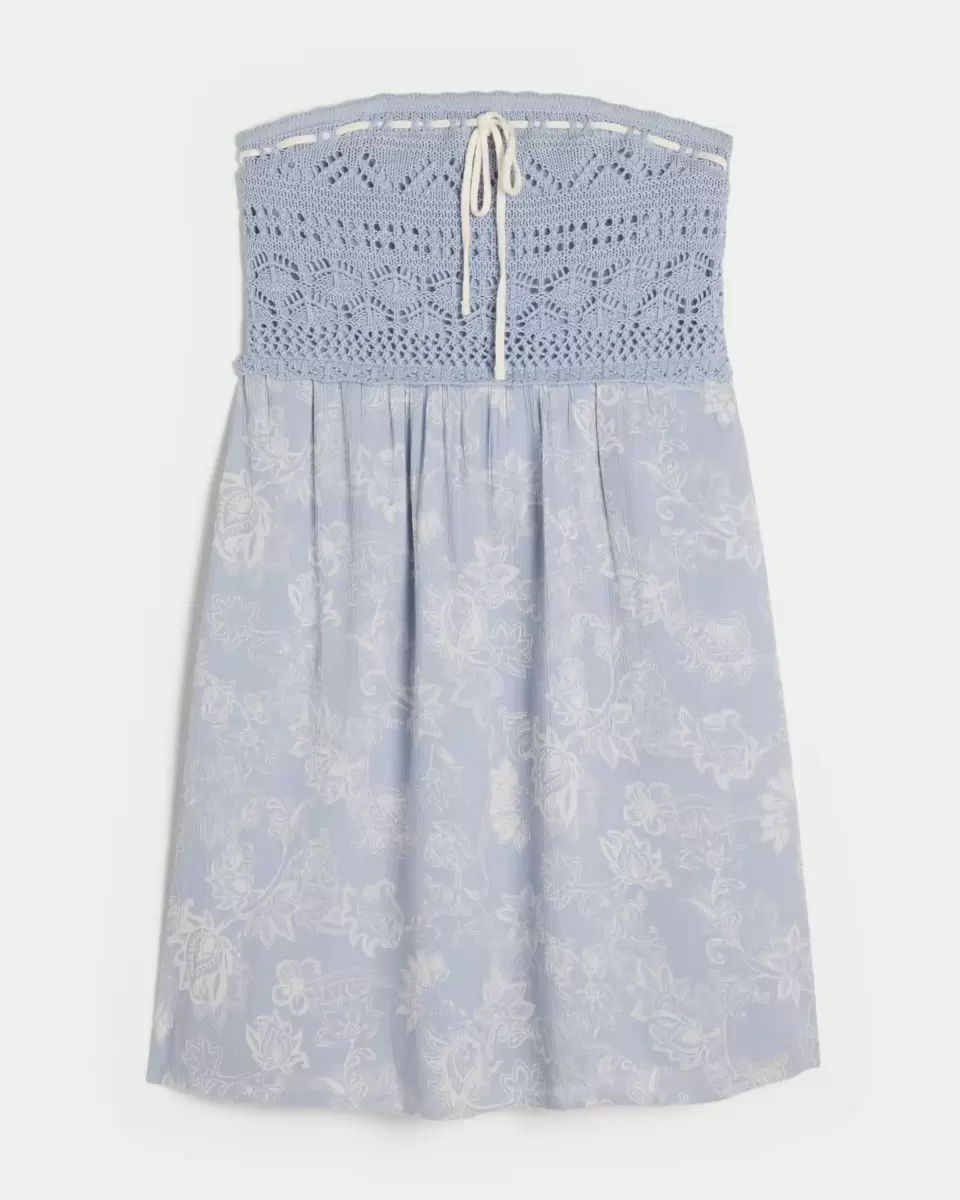 Ta śliczna mini sukienka ma gorset wykonany z materiału szydełkowego, a dekolt zdobi pasmanteria. Zwiewna spódnica. Produkt importowany.