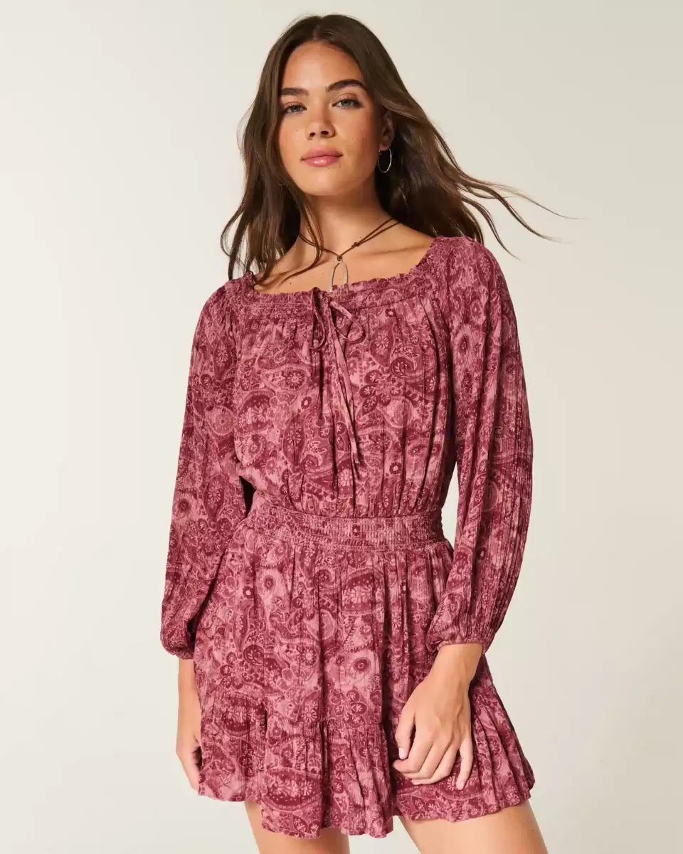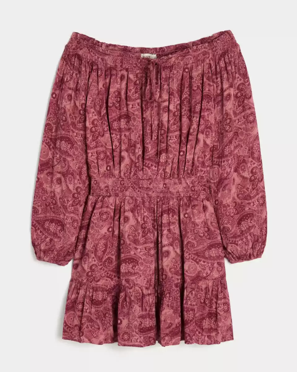 Zwiewna i supermiękka sukienka z luźnym dekoltem, który można nosić na ramionach lub je odsłonić. Wiązanie na środku dekoltu, długie rękawy, wzór na całej powierzchni. Produkt importowany.