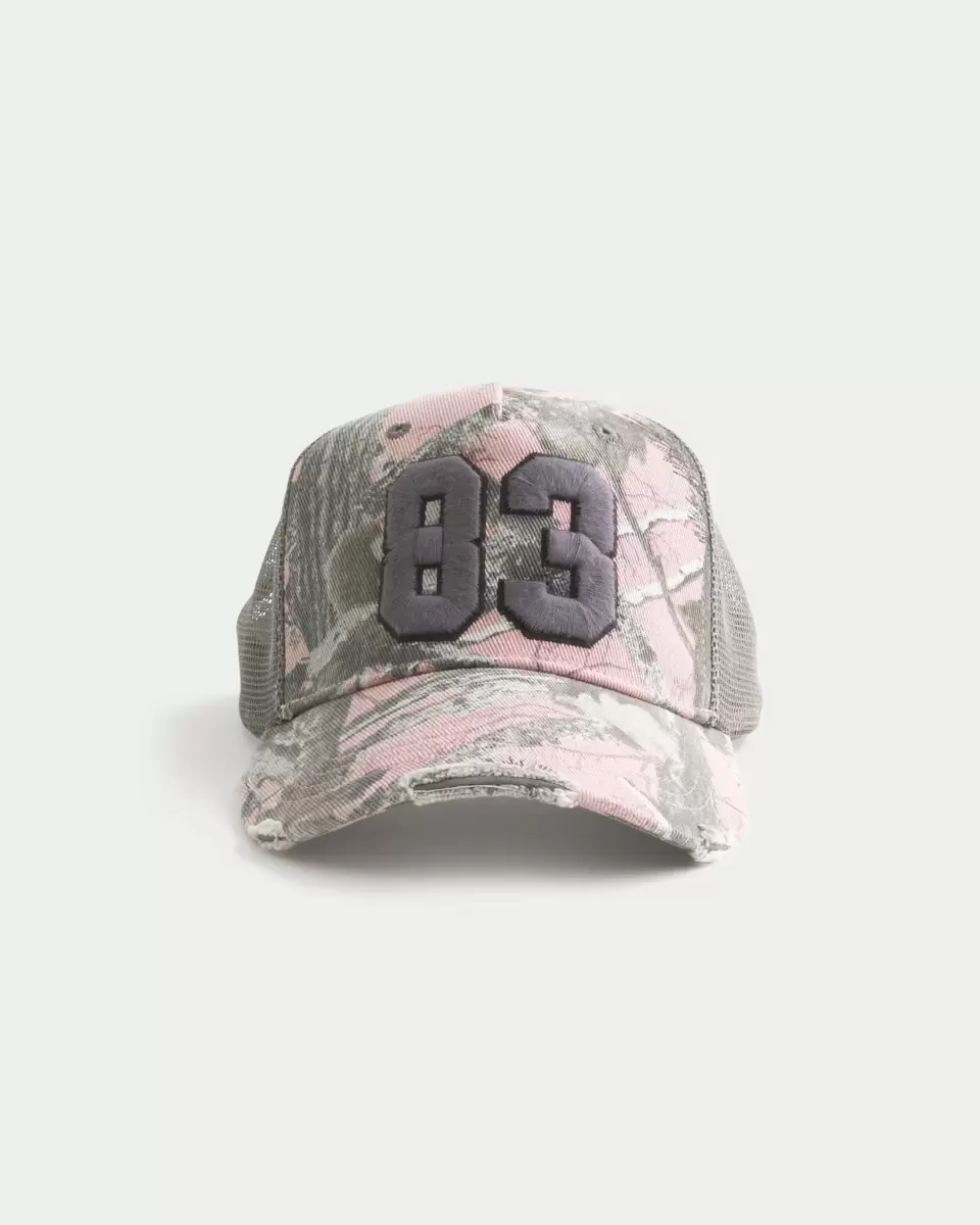Klasyczna czapka typu trucker z siateczkowym tyłem i różowym wzorem moro z przodu. Aplikacja z graficznym numerem, przetarcia, regulowana. Produkt importowany.
