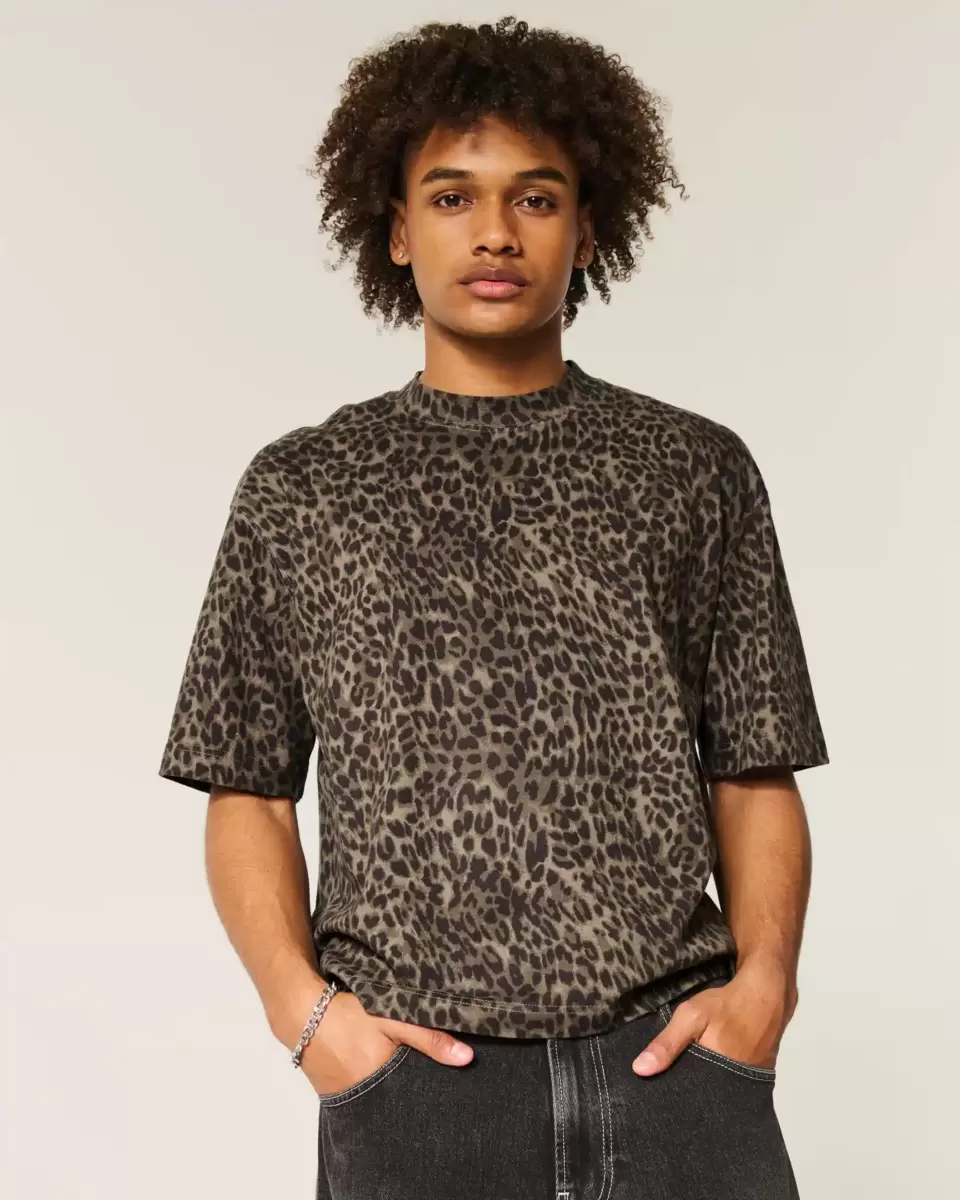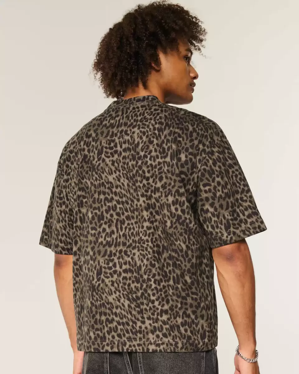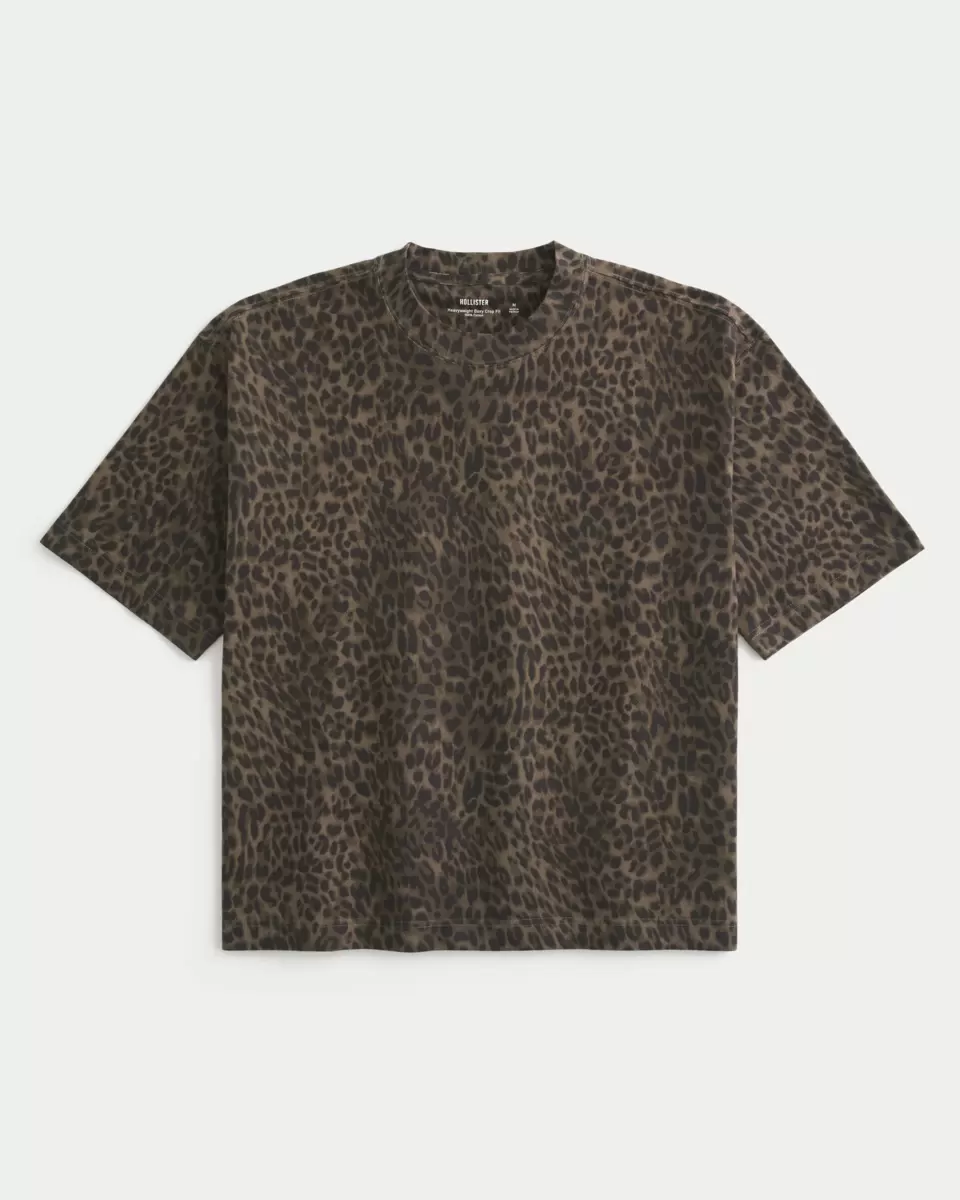 Supermiękka koszulka z grubej bawełny 100% z nadrukiem w panterkę na całej powierzchni. Okrągły dekolt, krótkie rękawy. Luźny, krótki krój.