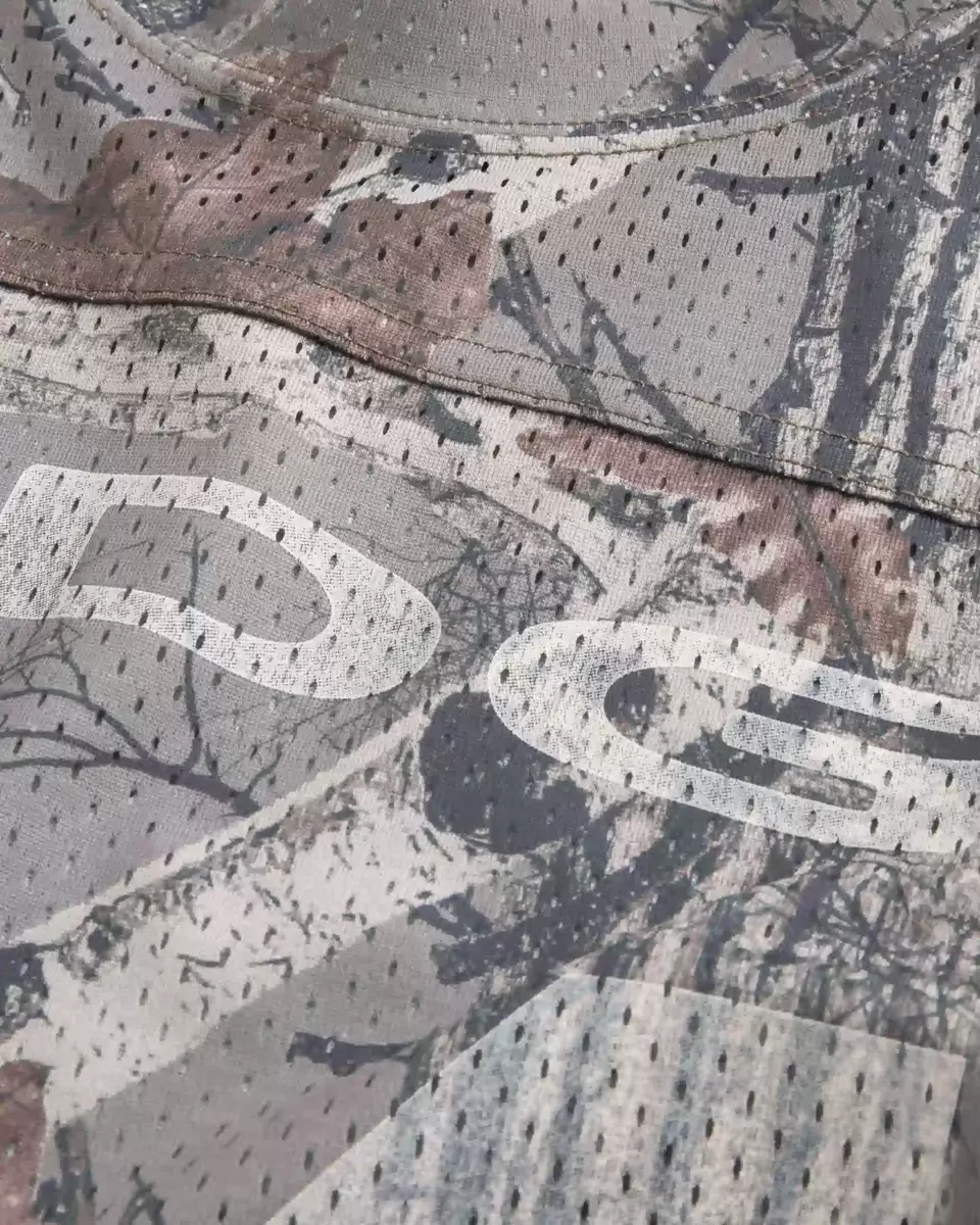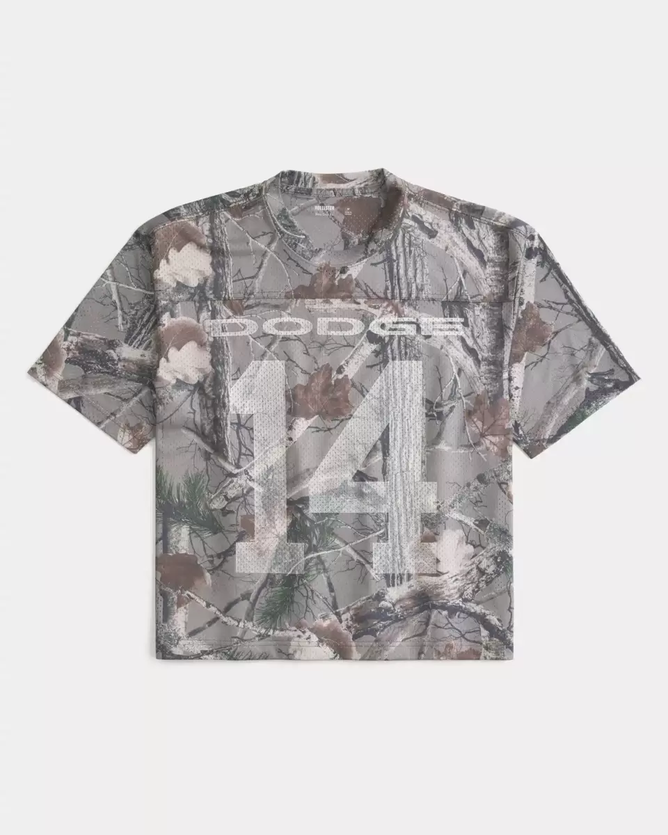 Ta siateczkowa koszulka ma oficjalny, licencjonowany nadruk Dodge Hellcat i numer z przodu i z tyłu. Okrągły dekolt, krótkie rękawy, wzór kamuflażowy na całej powierzchni. Krótszy, pudełkowy krój.