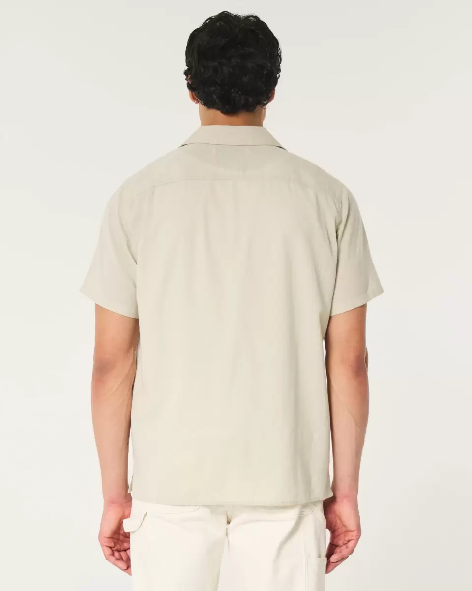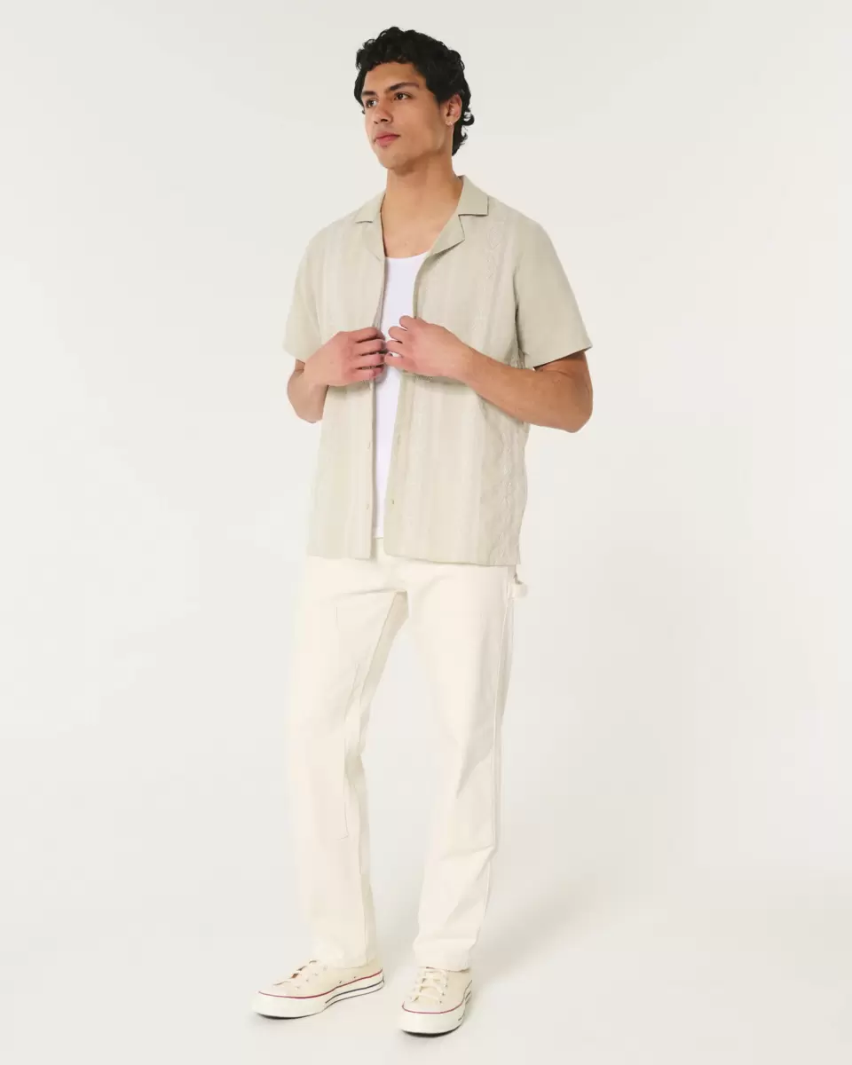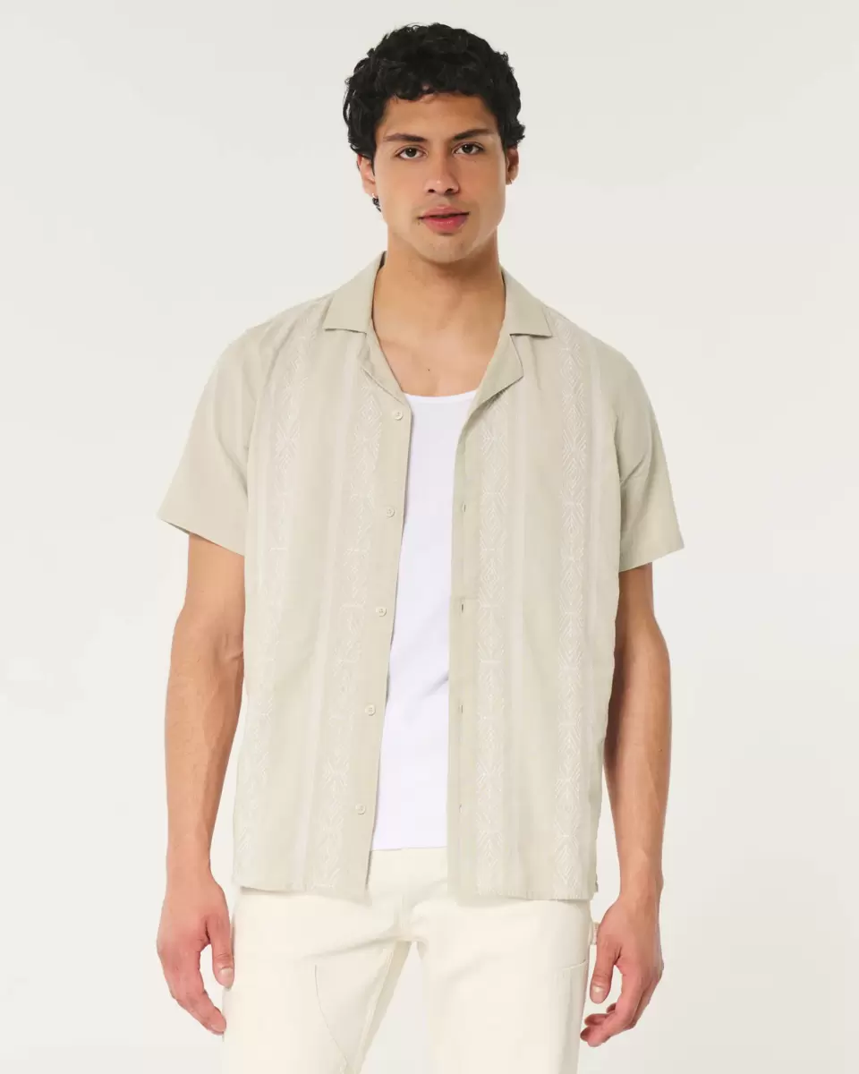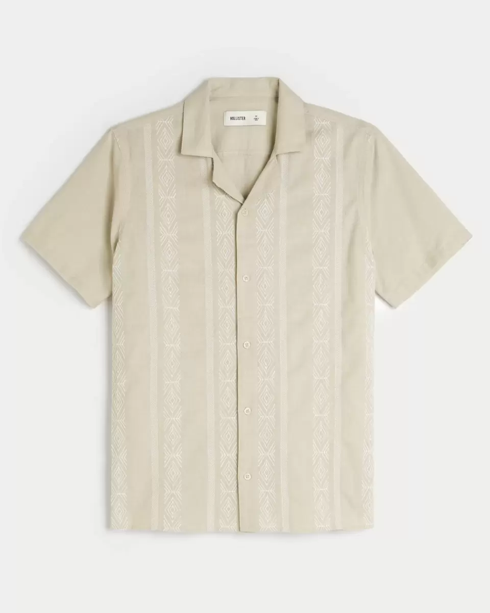 Ta klasyczna koszula ma haftowane wzory na całej powierzchni, zapięcie na guziki, kołnierzyk i krótkie rękawy. Luźny krój.