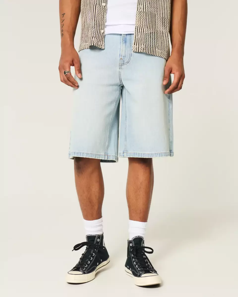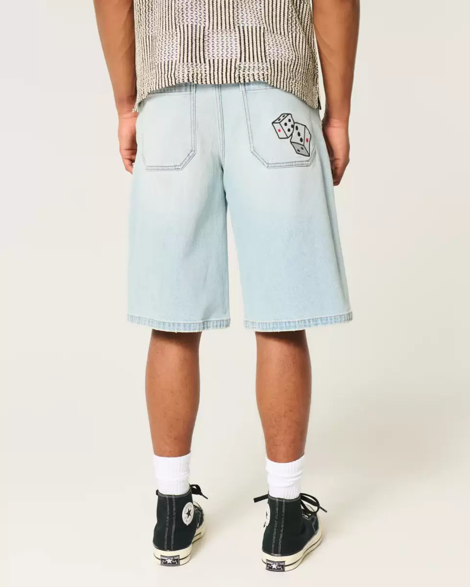 Wygodne szorty jeansowe w jasnym kolorze, z bardzo luźną nogawką. Wyblakły, graficzny haft w kształcie kostki na tylnej kieszeni. Importowane.