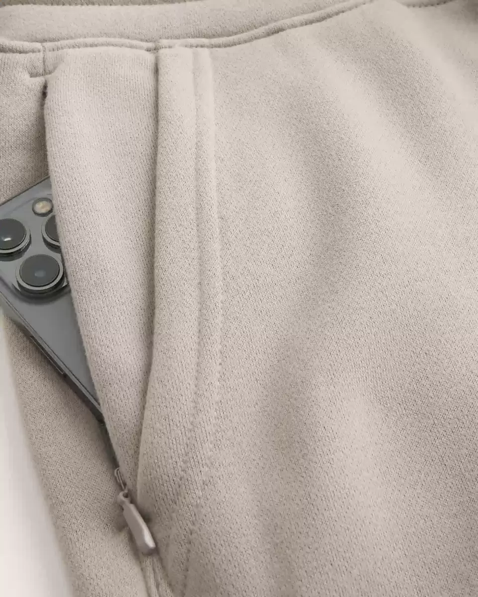 Supermiękkie, polarowe spodnie dresowe z luźnymi nogawkami i ściągaczem w pasie. Kieszenie, prawa kieszeń na zamek, ściągacze u dołu.