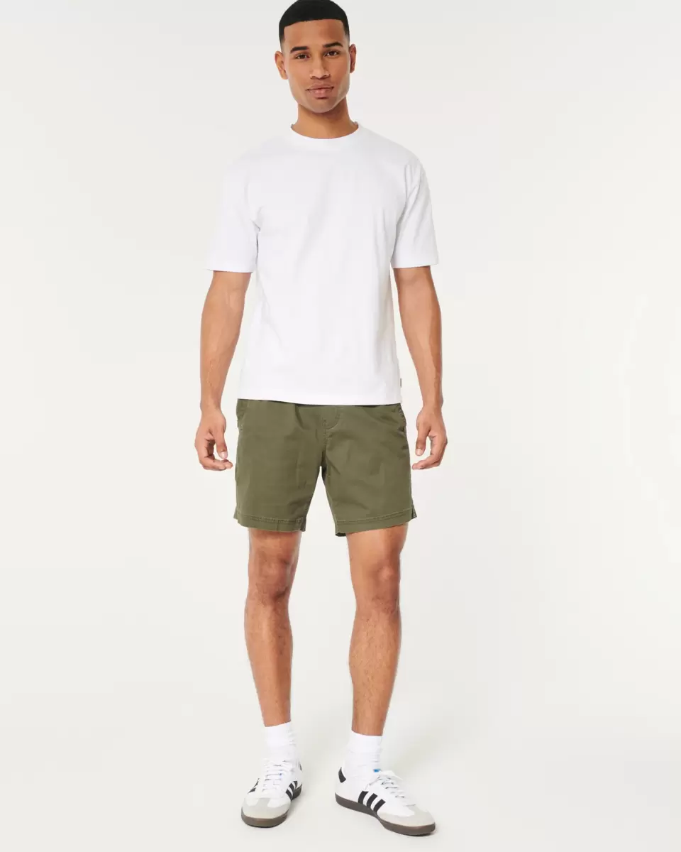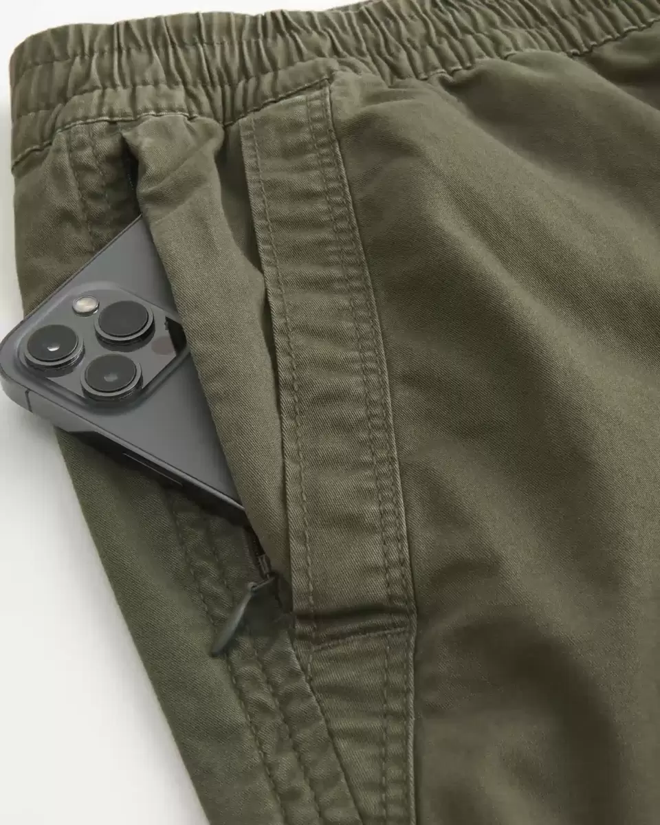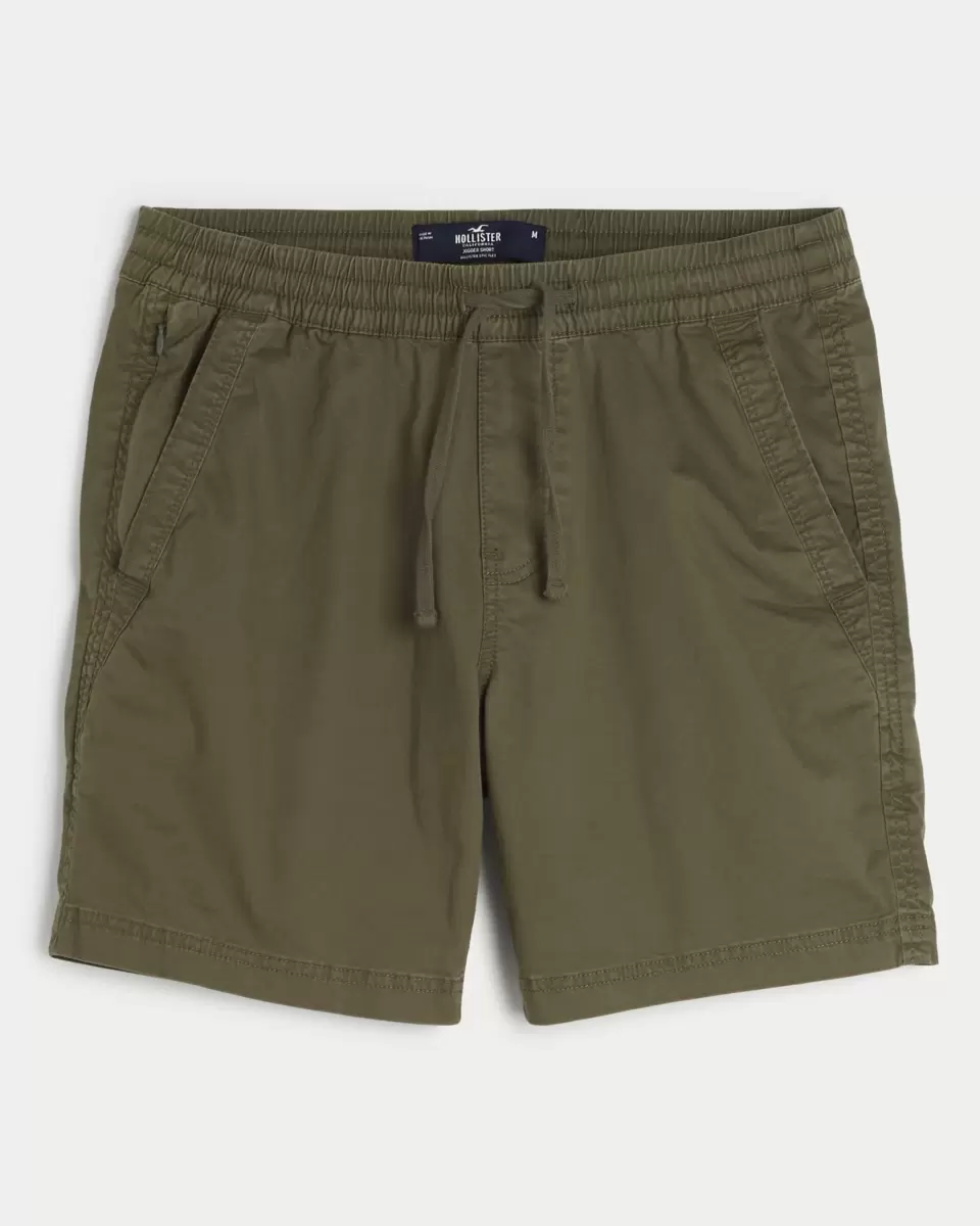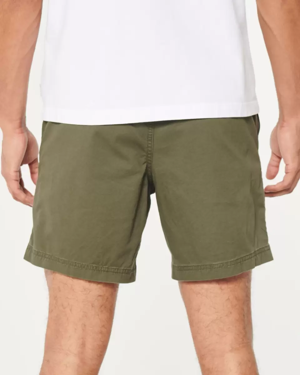 Wygodne, wciągane szorty z tkaniny twill Hollister Epic Flex, z kieszeniami z przodu i miękkim ściągaczem w pasie. Ukryta kieszeń na telefon. Długość nad kolano. Długość wewnętrzna nogawki 7 cali. Importowane.