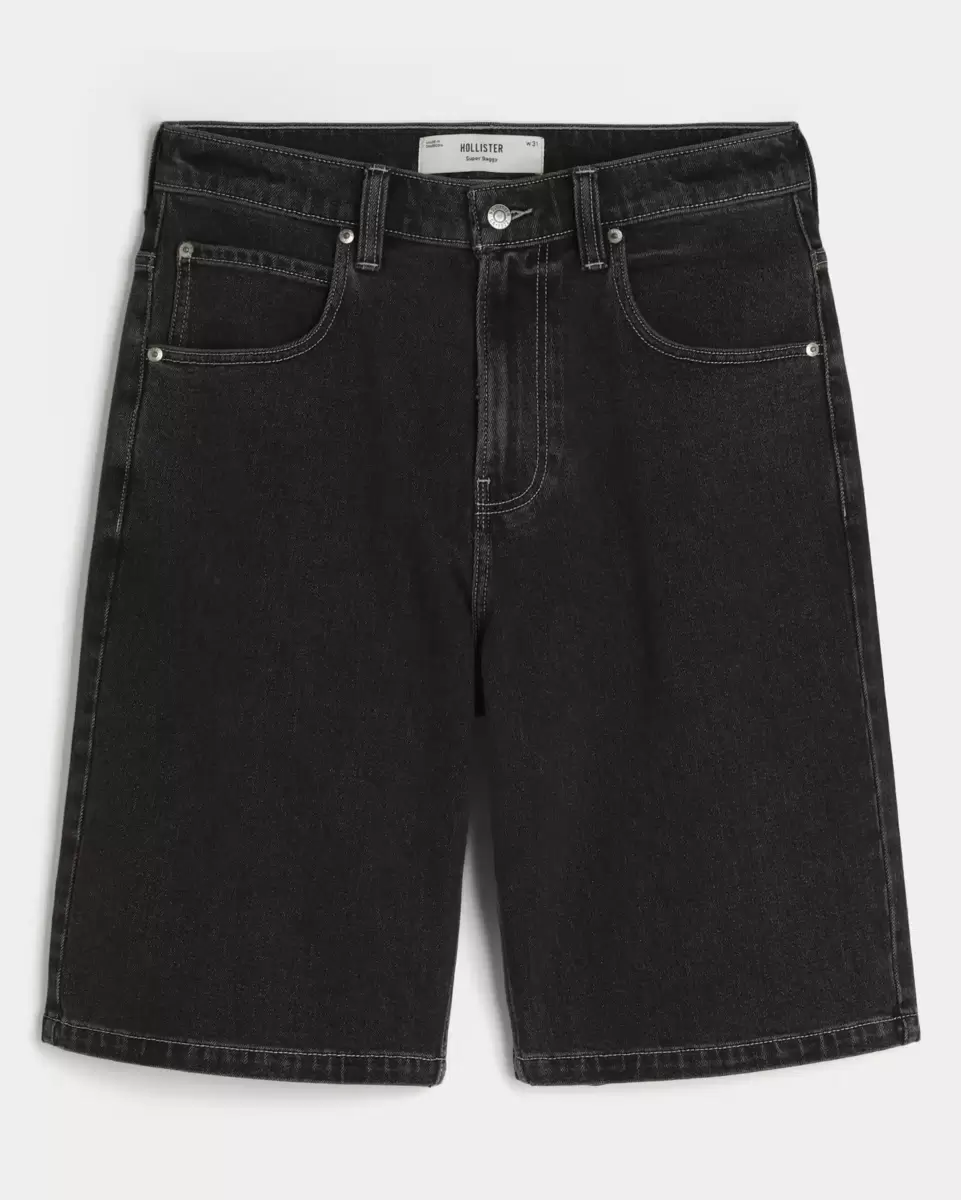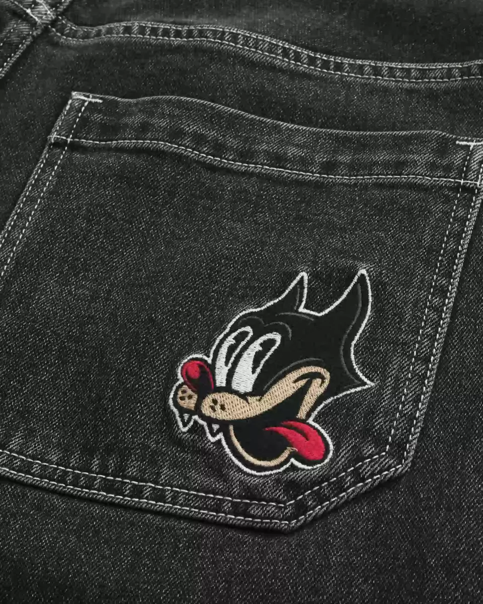 Wygodne szorty jeansowe w spranej czerni, z bardzo luźną nogawką sięgającą za kolano. Haft z kotem na tylnej kieszeni. Importowane.