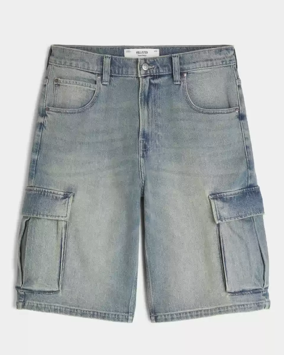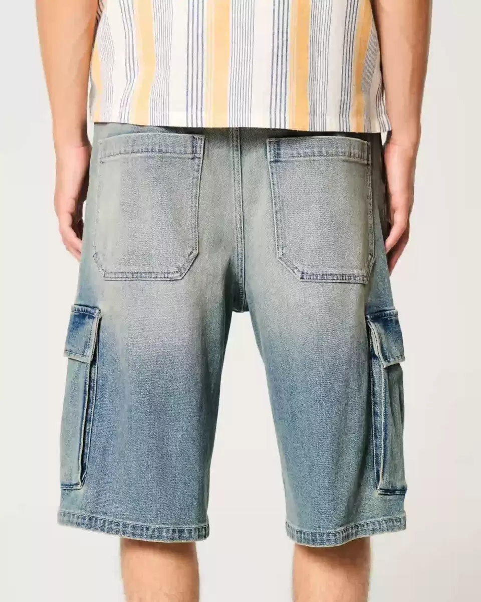 Ultrawygodne szorty jeansowe o luźnym kroju z bocznymi kieszeniami cargo. Średnio sprane, z przetarciami i przetarciami. Sięgają za kolano. Importowane.