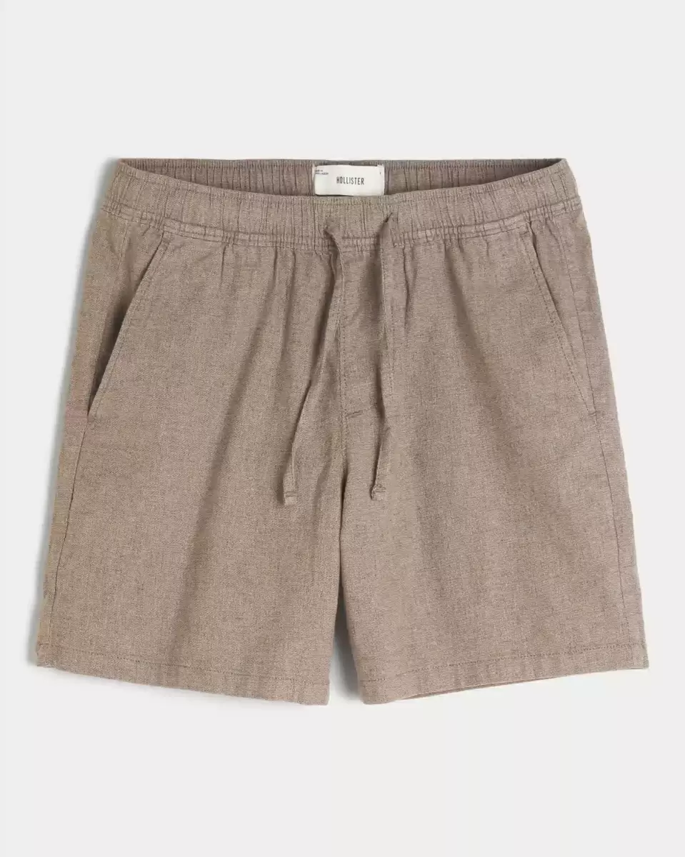 Ultrawygodne szorty z miękkiej mieszanki bawełny i lnu. Ściągacz w pasie, kieszenie, długość wewnętrzna nogawki 20 cm. Długość nad kolano.