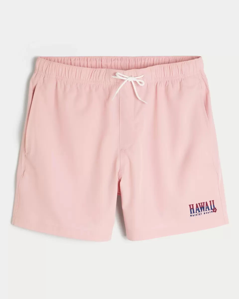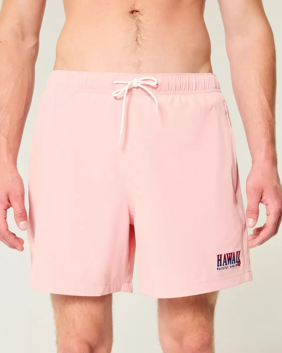 Krótsze kąpielówki sięgające do połowy uda. Wykonane z wygodnego, rozciągliwego w czterech kierunkach materiału i mają 15-centymetrowy (6-calowy) szew wewnętrzny. Kieszenie, ściągacz w pasie, haftowana grafika Waikiki Beach Hawaii. Produkt importowany.