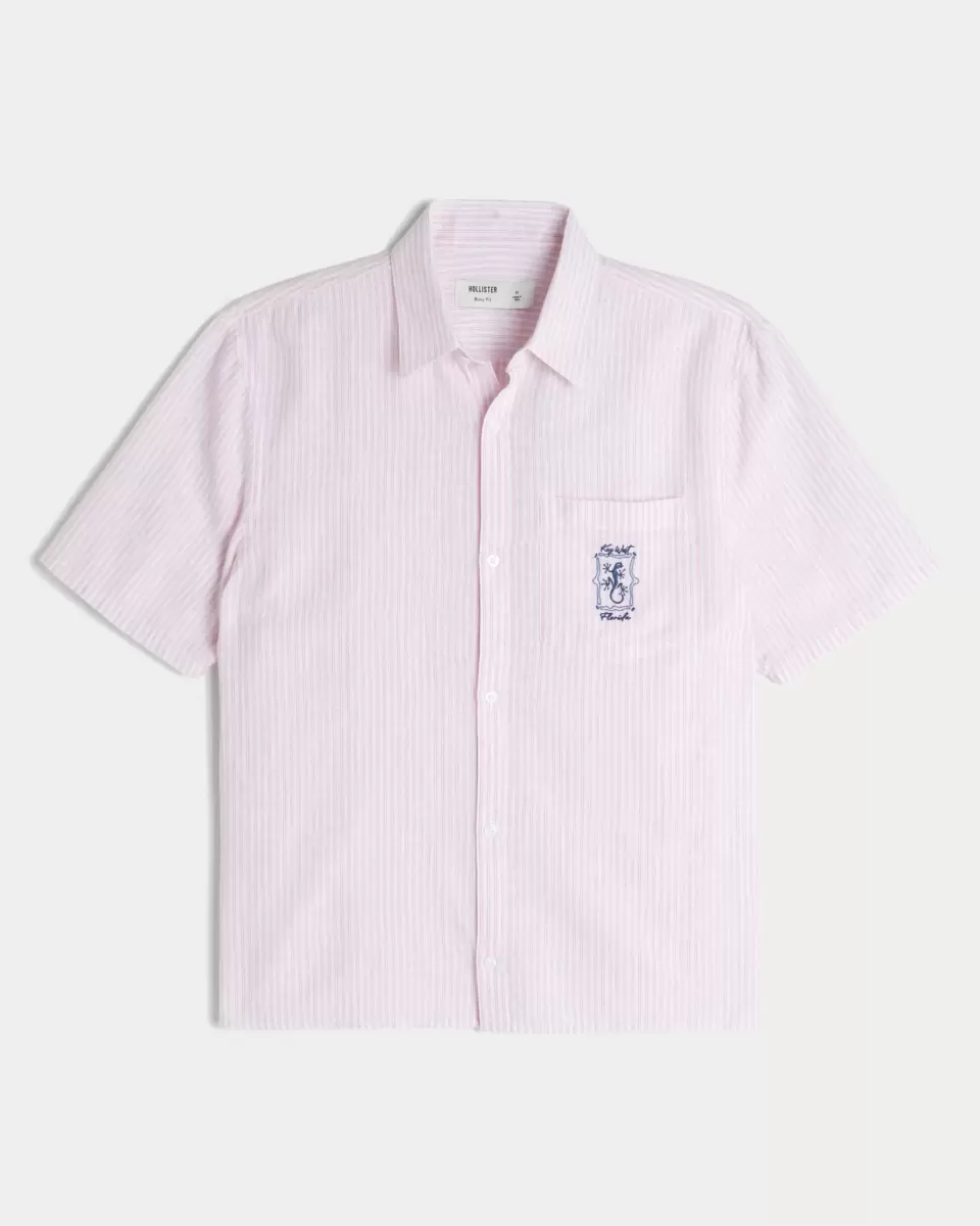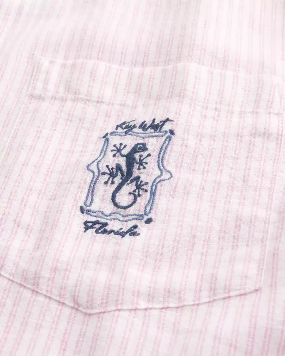 Ta klasyczna koszula wykonana jest z miękkiej mieszanki lnu i ozdobiona jest graficznym haftem Key West Florida na lewej kieszeni na piersi. Kołnierzyk typu „böck”, krótkie rękawy, zapięcie na guziki. Luźny krój. Importowane.