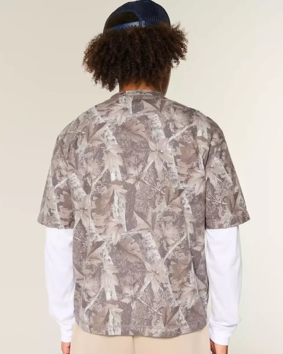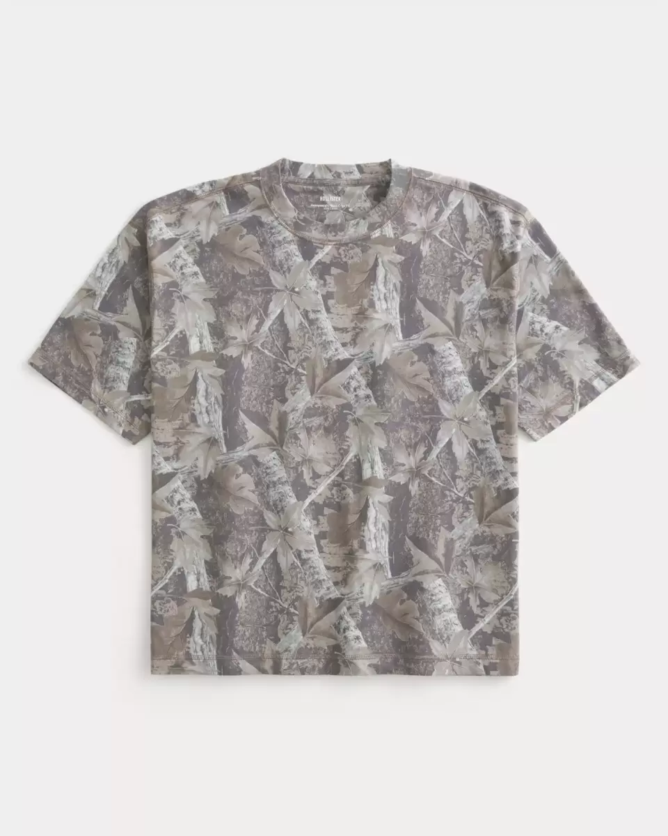 Supermiękki, ciężki T-shirt ze 100% bawełny z okrągłym dekoltem i krótkimi rękawami. Wzór kamuflażowy na całej powierzchni. Krótszy, pudełkowy krój.