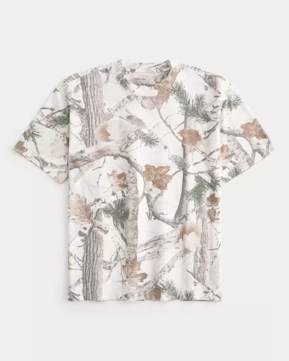Ultrawygodna koszulka z grubej bawełny 100% z wzorem moro na całej powierzchni. Okrągły dekolt, krótkie rękawy. Luźny krój. Produkt importowany.