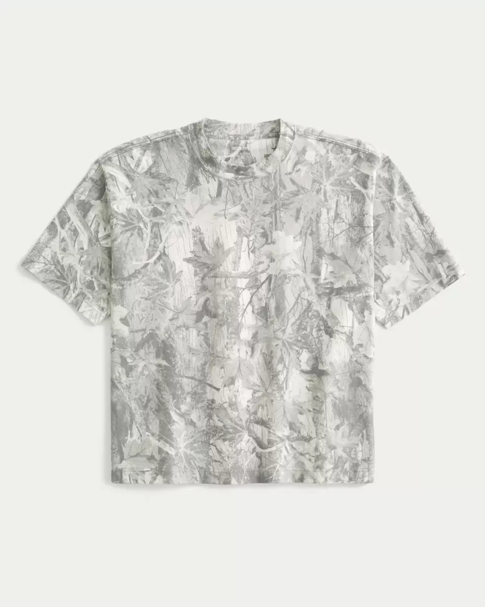 Ten klasyczny T-shirt wykonany jest w 100% z supermiękkiej, grubej bawełny i ma wzór kamuflażowy na całej powierzchni. Ma pudełkowy fason, skróconą długość, okrągły dekolt i krótkie rękawy. Krótszy krój. Produkt importowany.