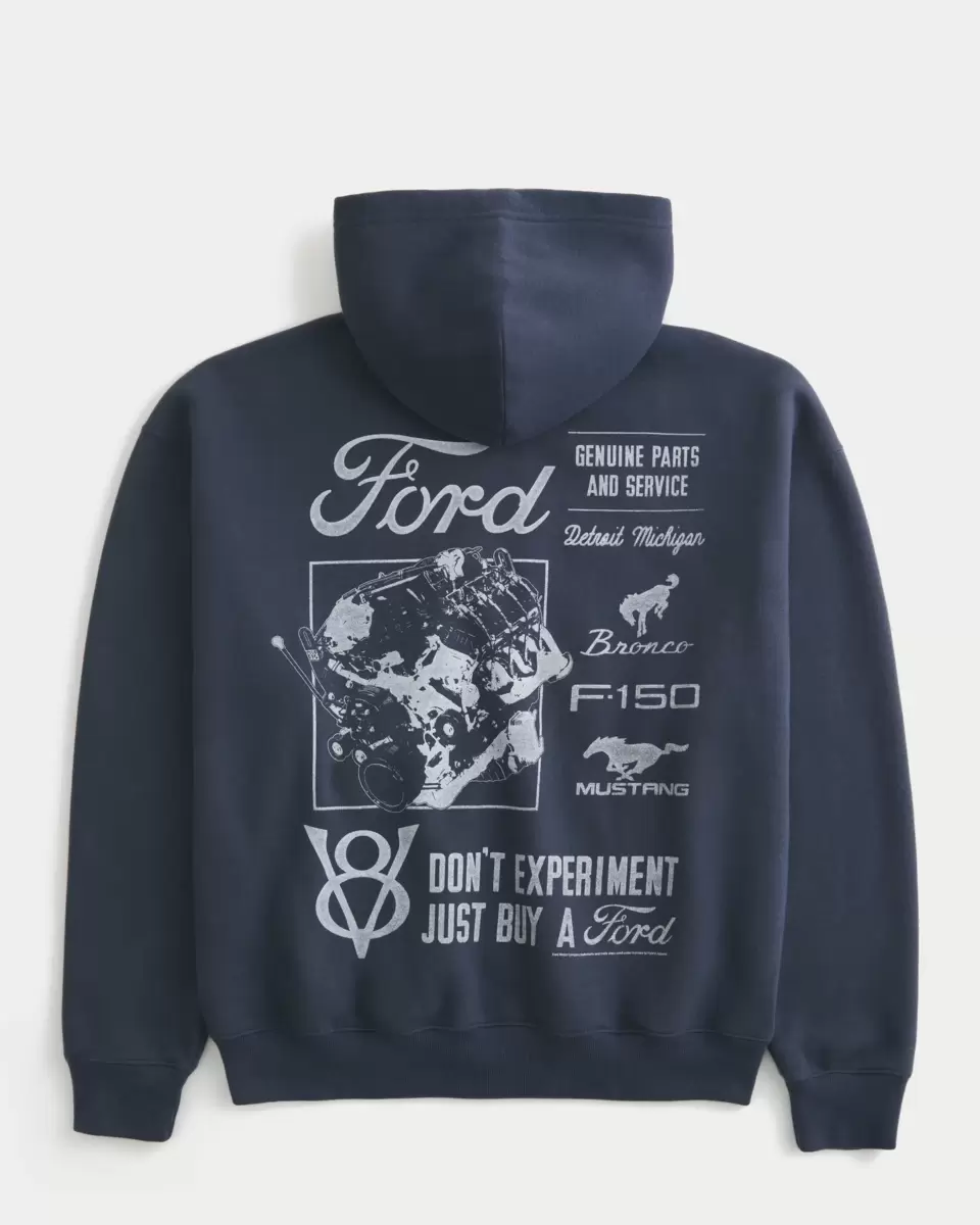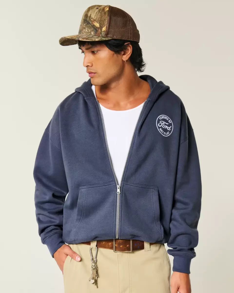 Supermiękka i wygodna bluza z kapturem z polaru z oficjalnym, licencjonowanym haftem Forda na lewej piersi i nadrukowaną grafiką z tyłu. Zapinana na suwak, kieszenie z przodu, kaptur, długie rękawy. Luźny krój. Importowane.