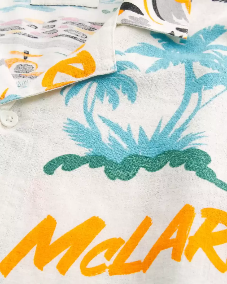 Klasyczna koszula z krótkim rękawem z nadrukiem zespołu McLaren Formula 1 na całej powierzchni. Krótkie rękawy, zapięcie na guziki, kołnierzyk, materiał z mieszanki lnu. Luźny krój. Produkt importowany.