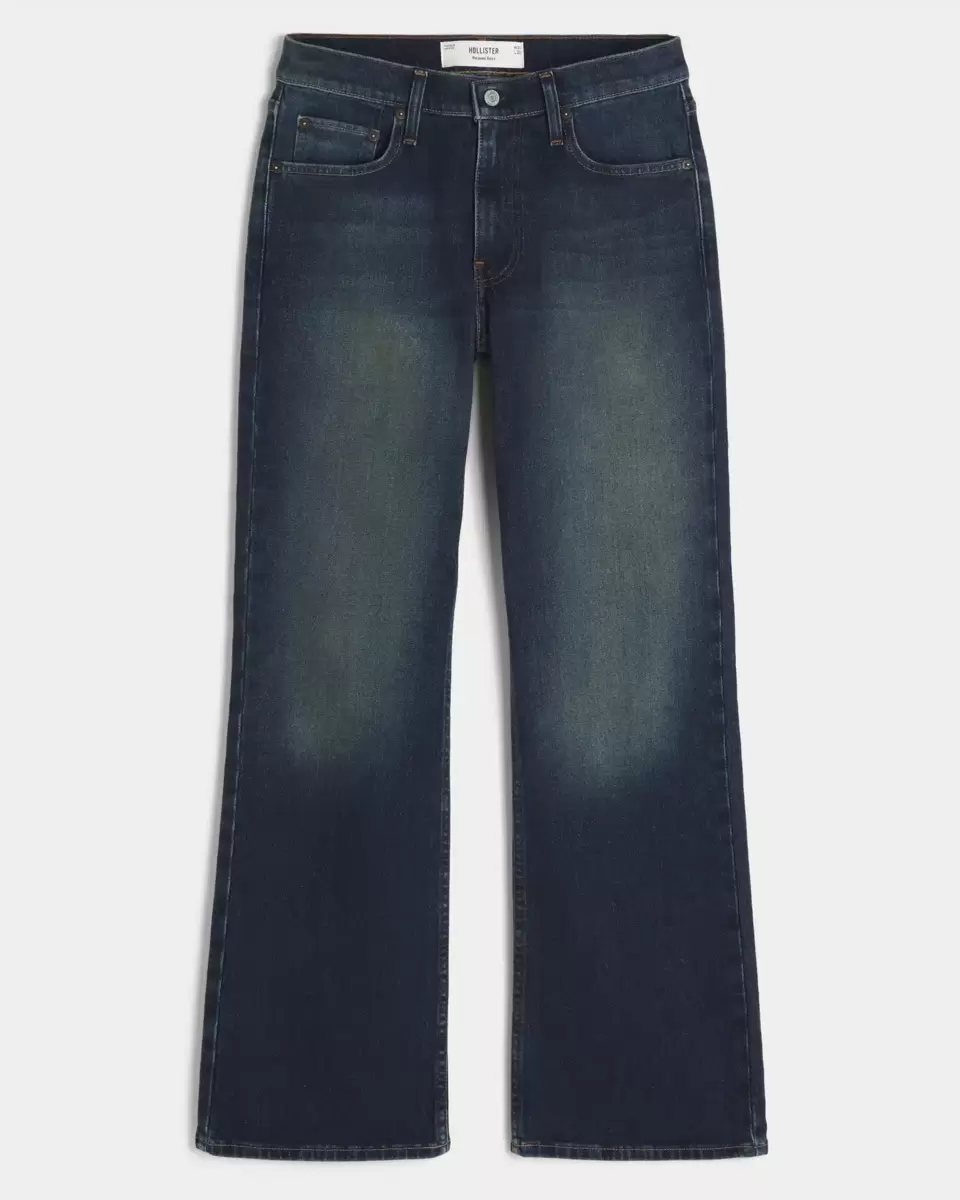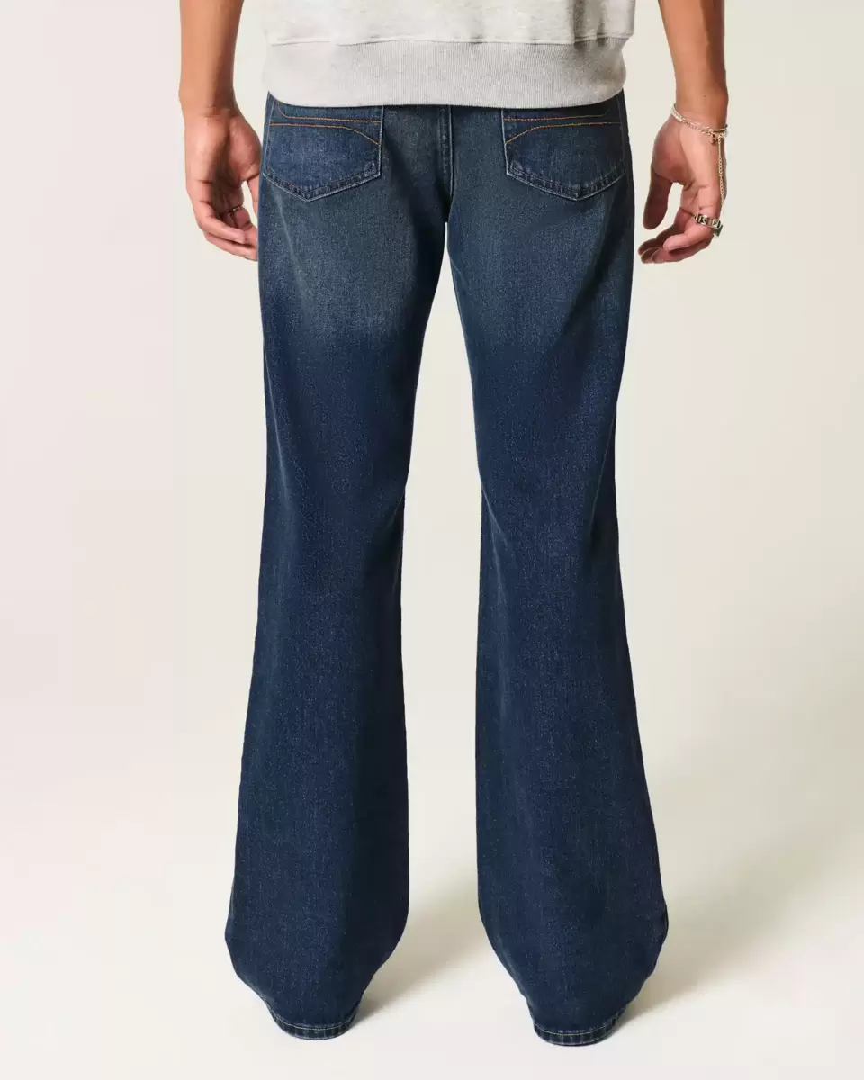 Wygodne jeansy w ciemnym odcieniu, z luźnymi nogawkami i wycięciami na buty. Wyblaknięcia, przetarcia. Importowane.