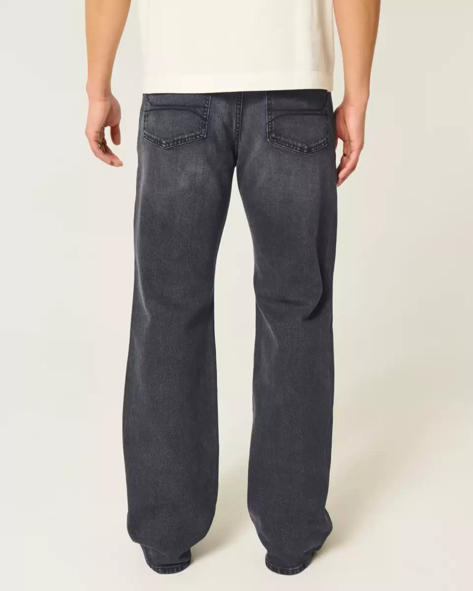 Klasyczne jeansy w spranej czerni, z luźnymi nogawkami i wycięciami na buty. Przetarcia i przetarcia.