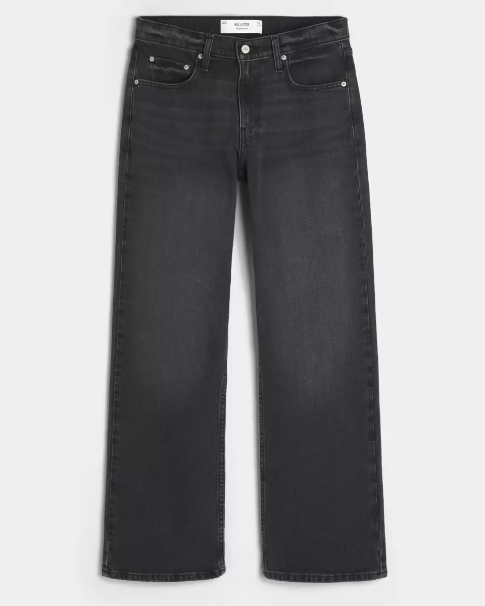 Klasyczne jeansy w spranej czerni, z luźnymi nogawkami i wycięciami na buty. Wyblaknięcia, przetarcia. Importowane.