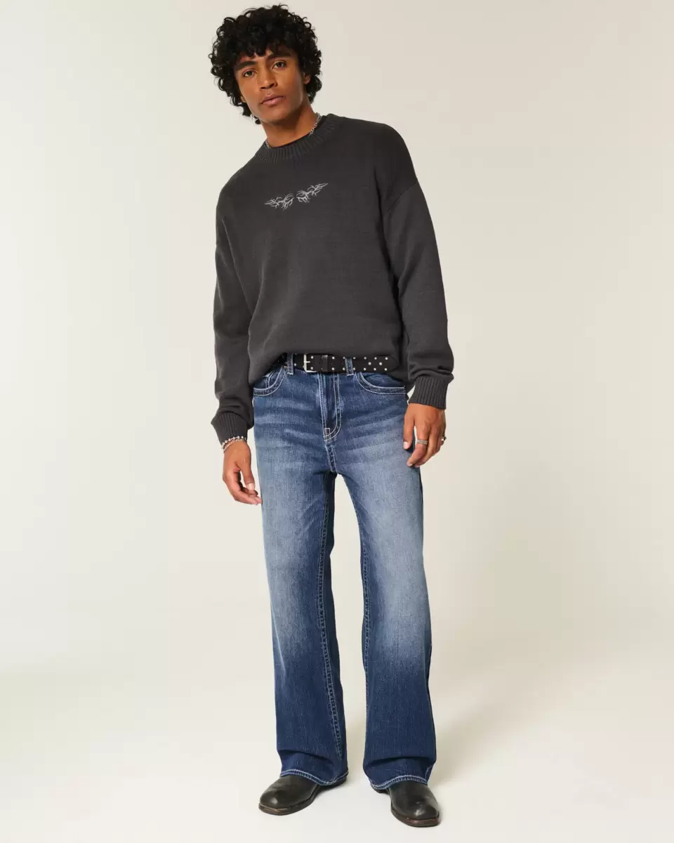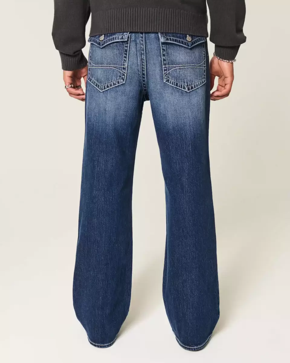 Wygodne jeansy z luźną nogawką i rozcięciem typu bootcut. Ciemne spranie z przetarciami i przetarciami, kieszonka na monety z klapką po prawej stronie. Importowane.