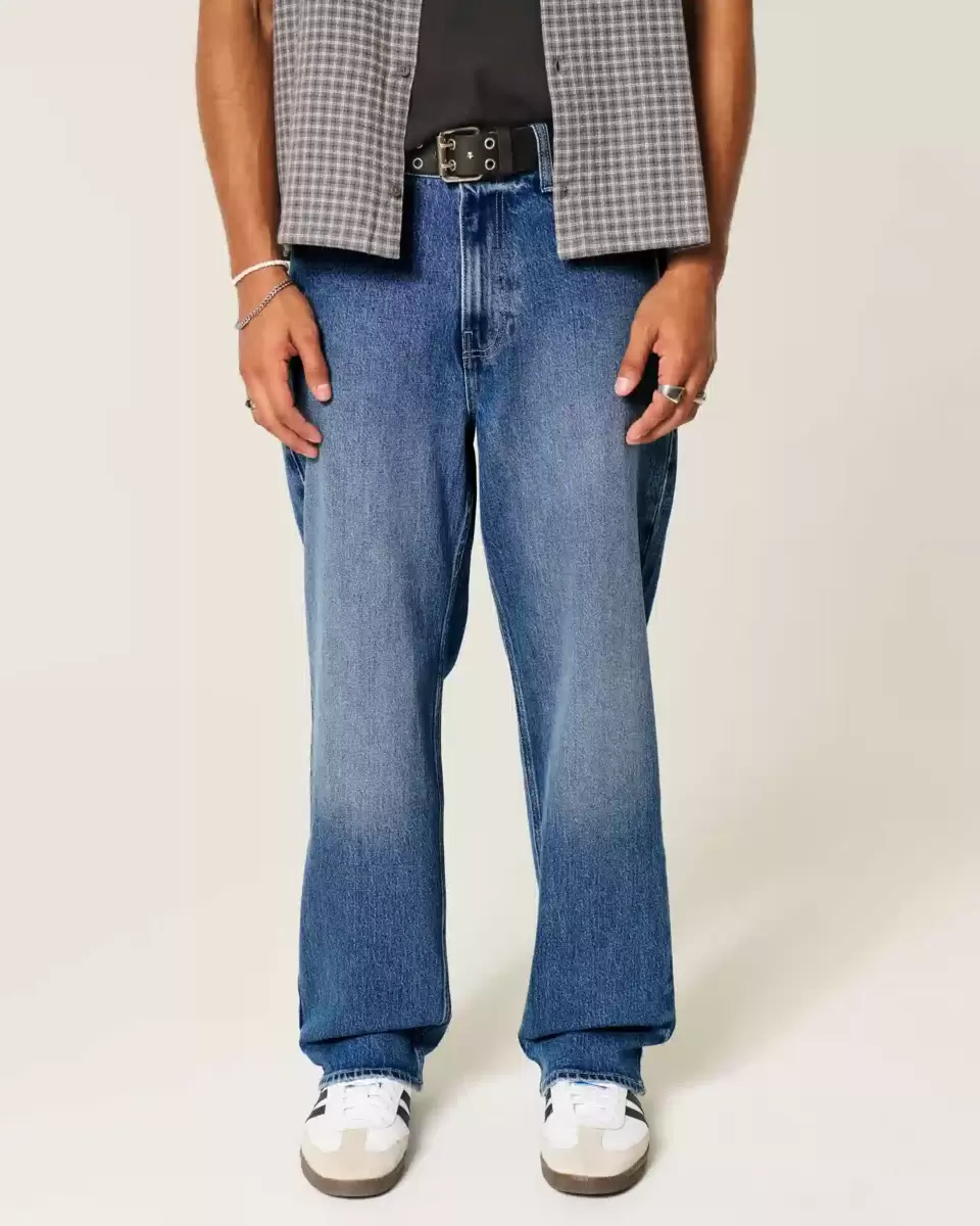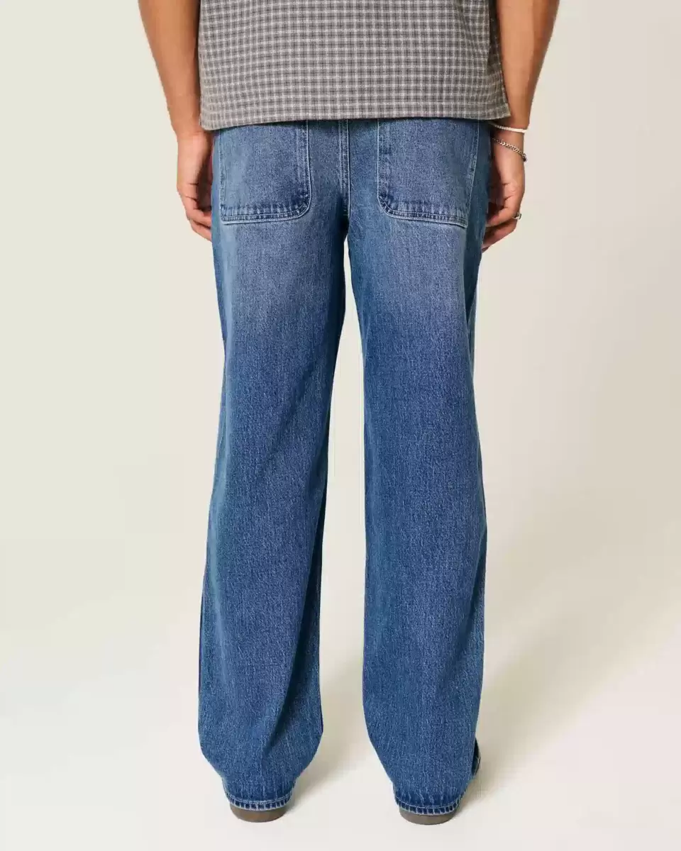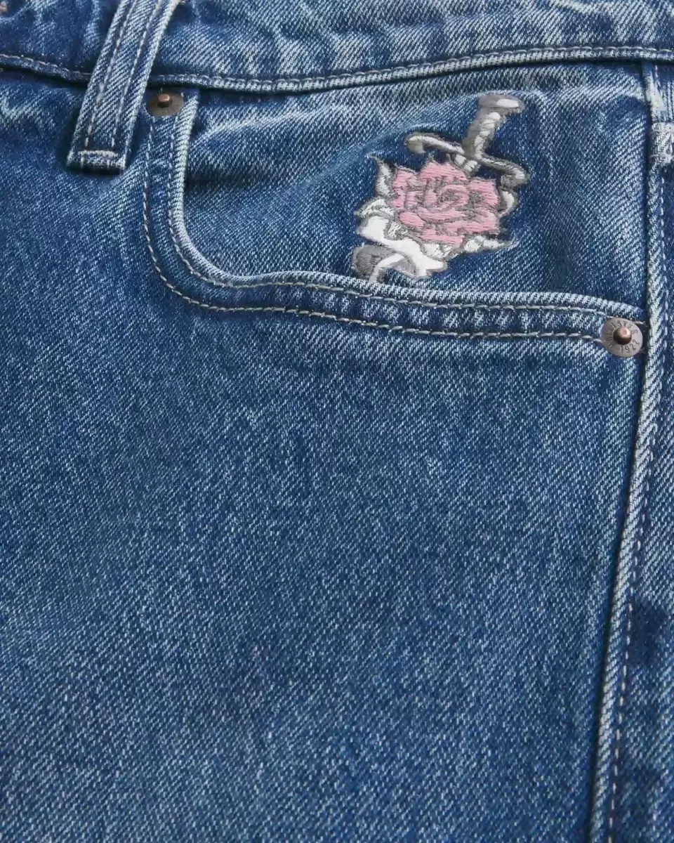 Wygodne jeansy w ciemnym odcieniu, z luźną nogawką. Grafika z różą i mieczem na prawej kieszeni, wyblakła. Importowane.