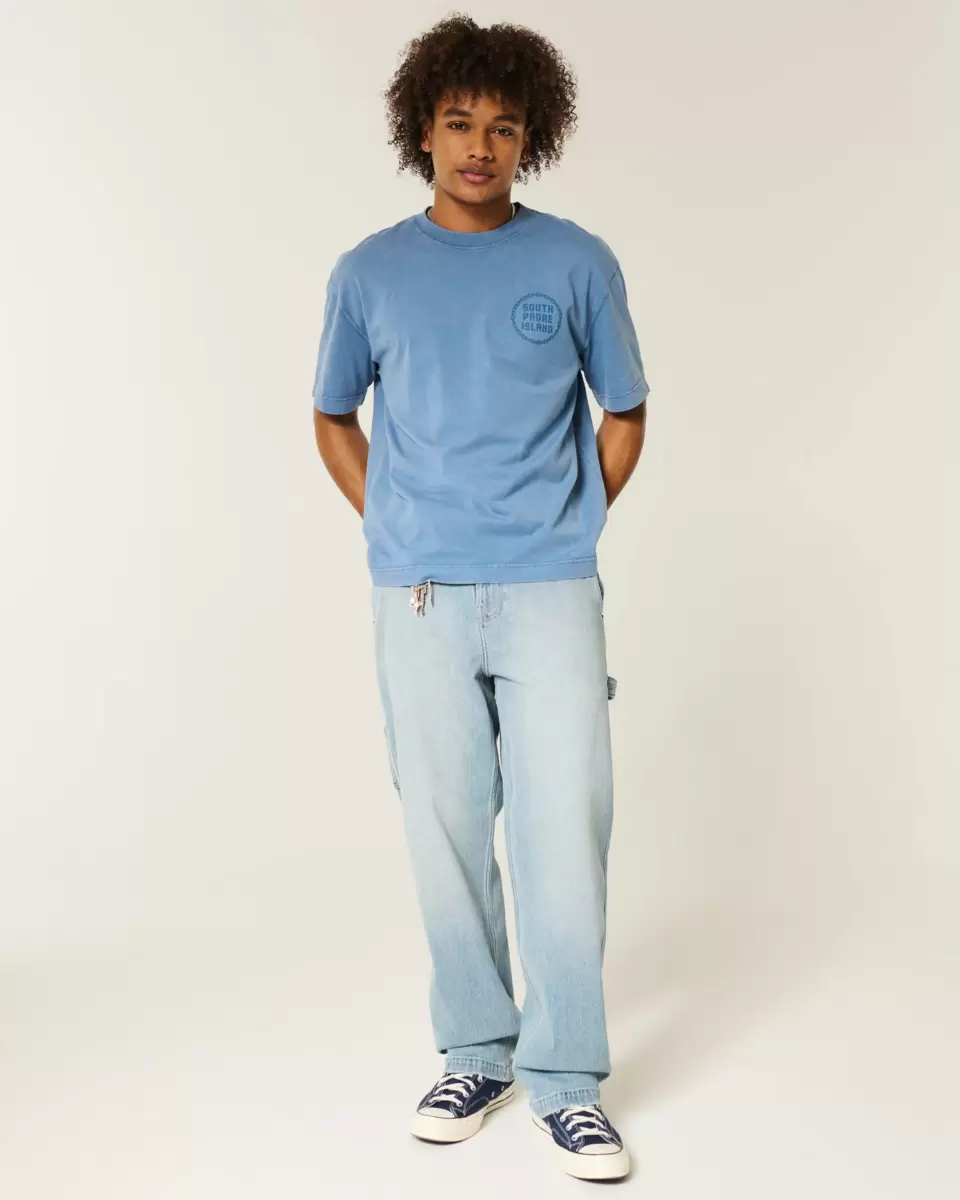 Wygodne jeansy typu painter w jasnym odcieniu, z luźną nogawką. Wyblakłe, z lewej strony ozdobione szlufką z haftem łańcuszkowym, dodatkowe kieszenie. Importowane.