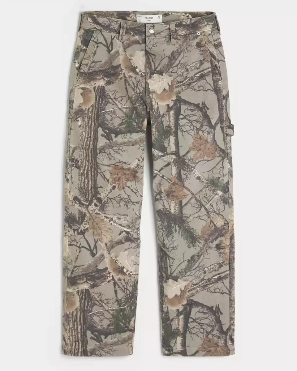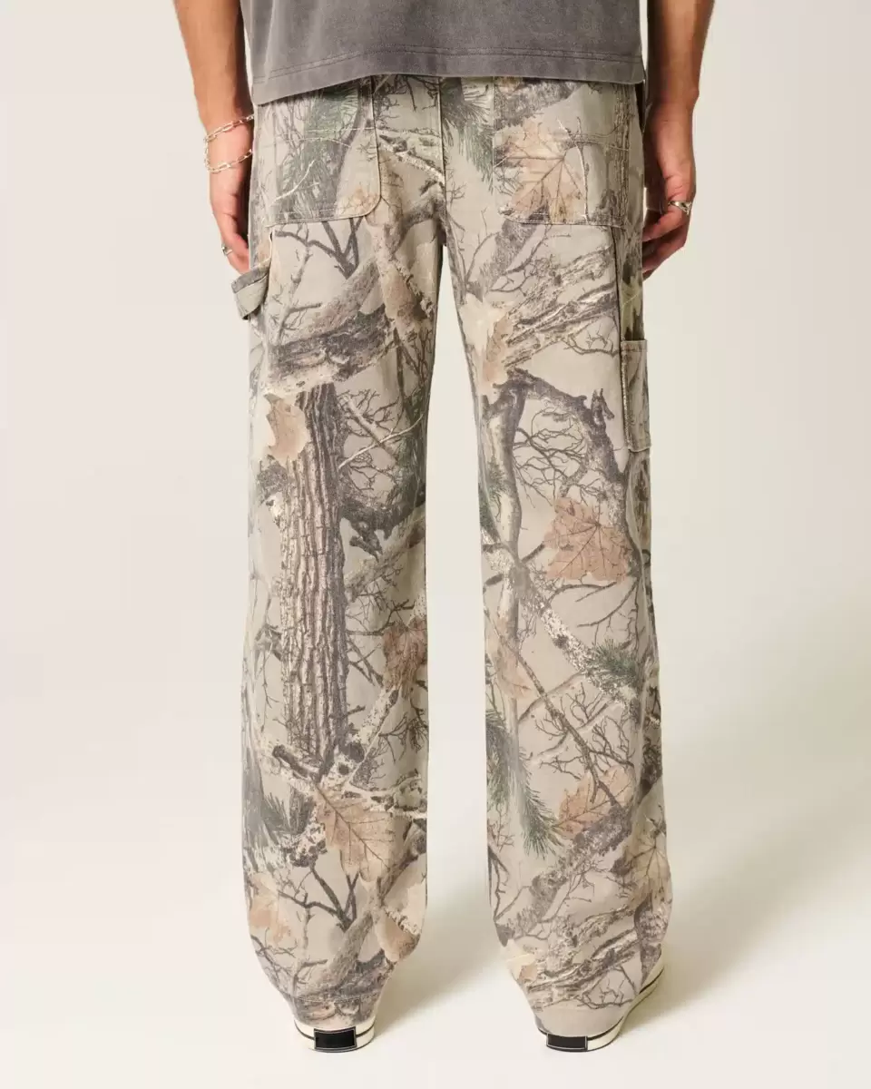 Wygodne jeansy z luźną nogawką, szlufką na pasek po lewej stronie i dodatkowymi kieszeniami. Wzór kamuflażowy na całej powierzchni. Produkt importowany.