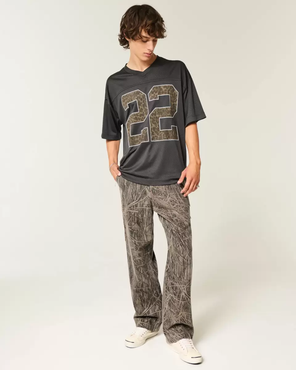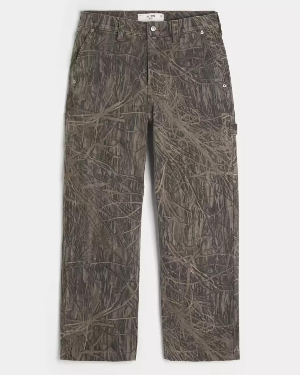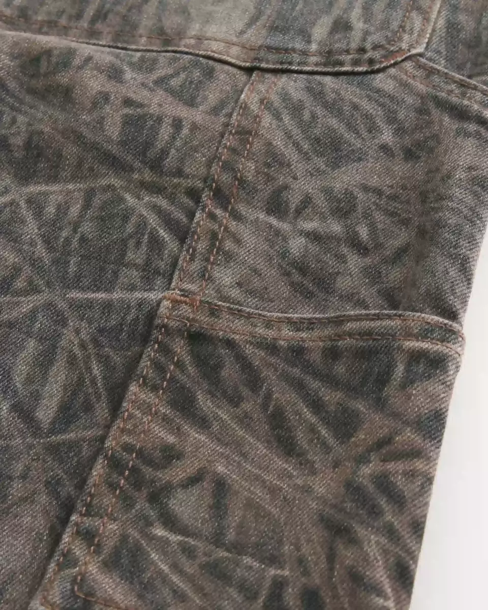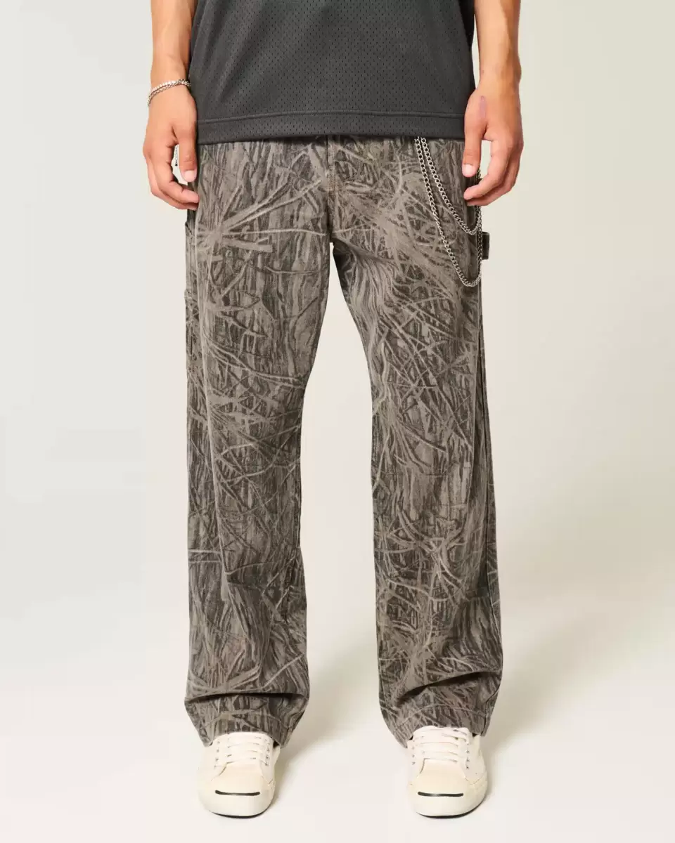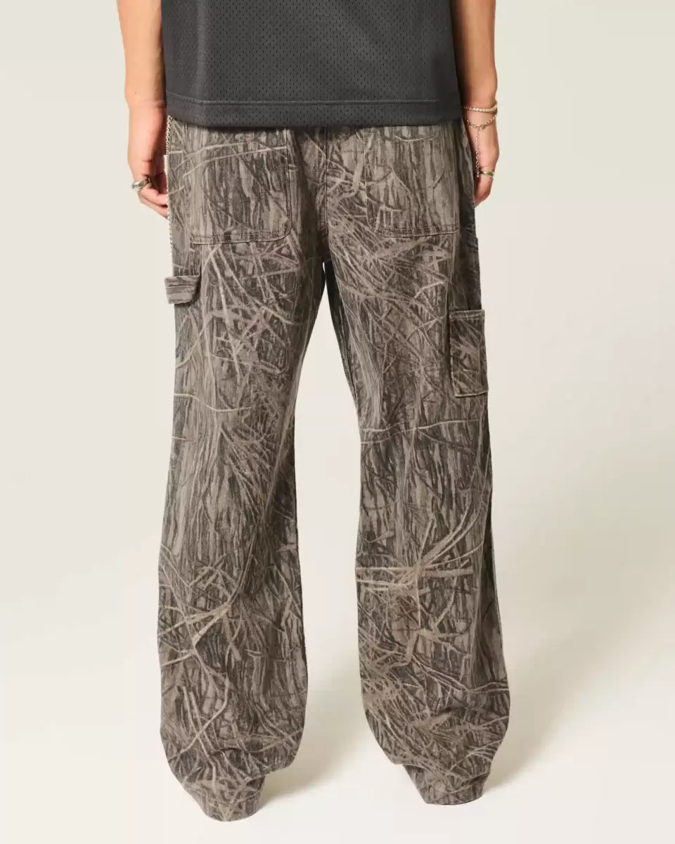Wygodne jeansy z luźną nogawką, szlufką na pasek po lewej stronie i dodatkowymi kieszeniami. Wzór kamuflażowy na całej powierzchni. Produkt importowany.