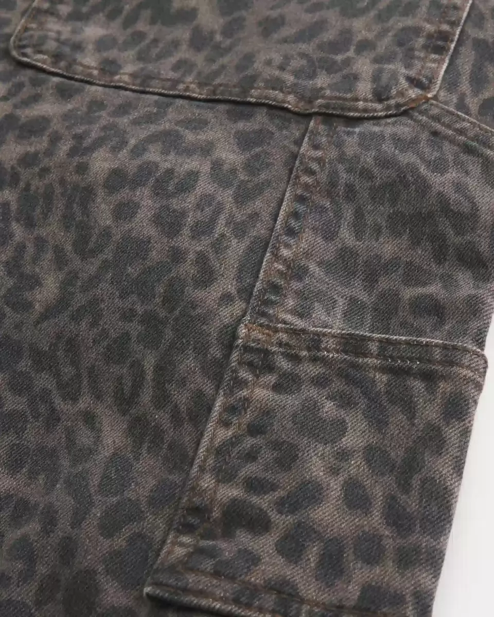 Wygodne jeansy w stylu malarza, z luźną nogawką. Nadruk w panterkę na całej powierzchni, szlufka na lewej nogawce, dodatkowe kieszenie.